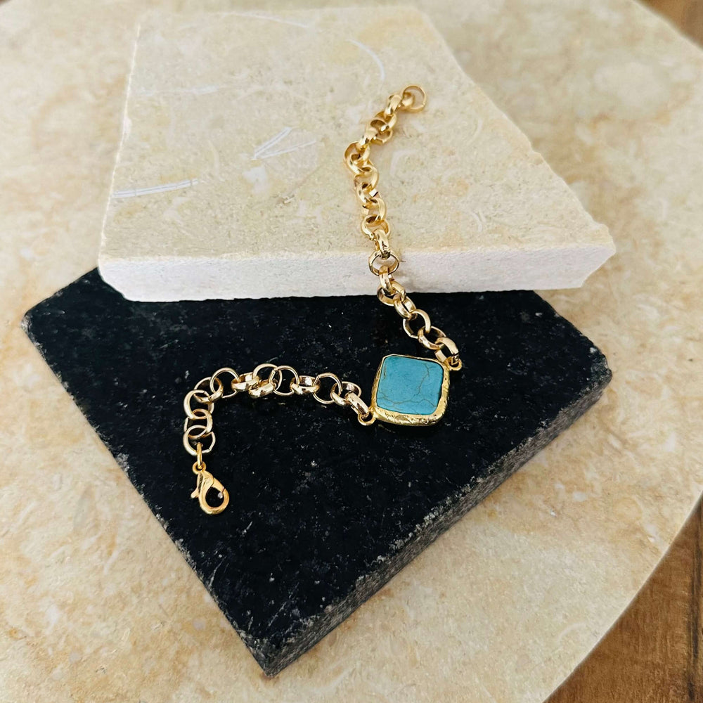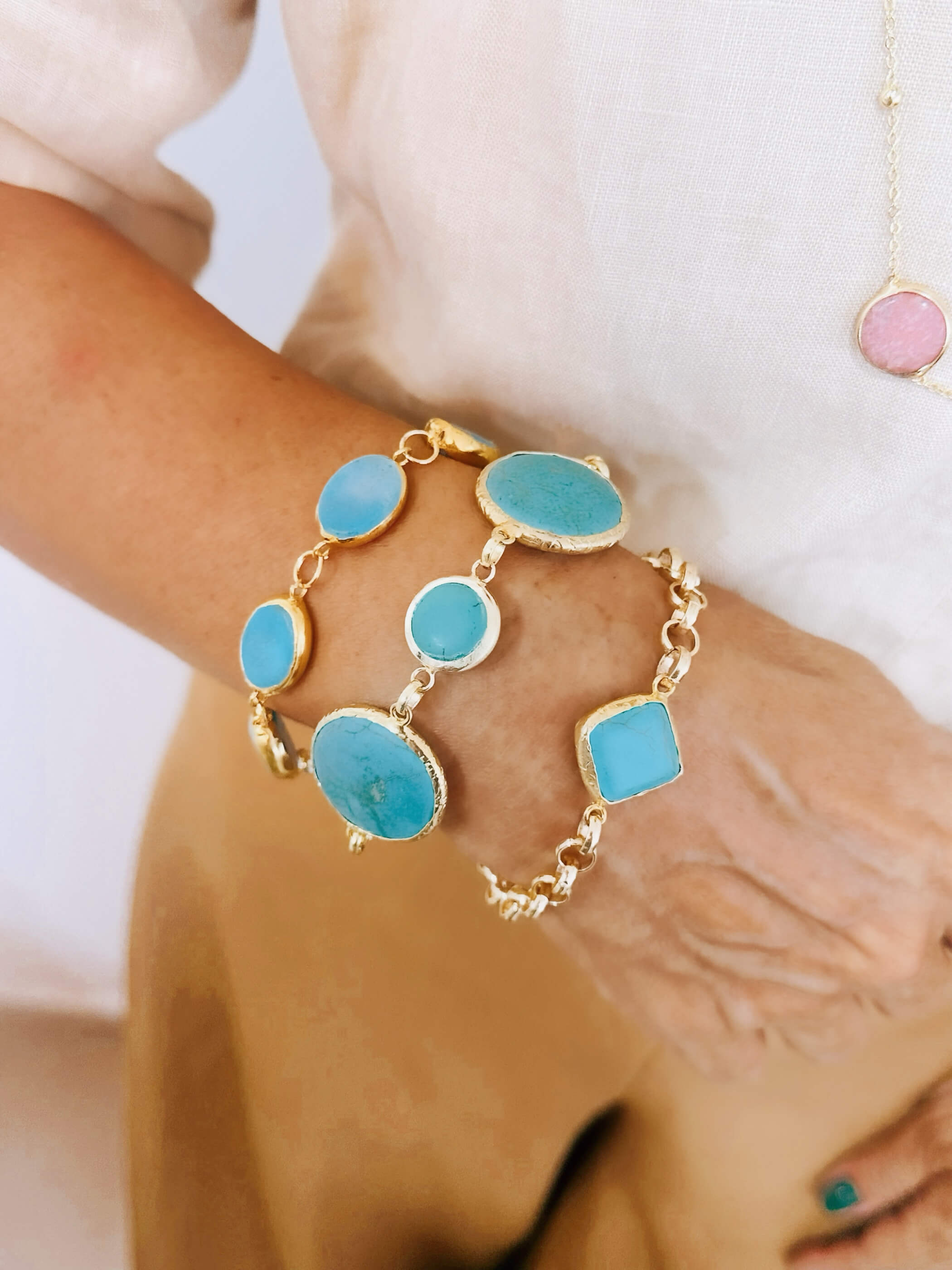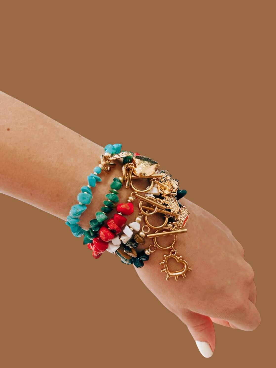 Hechas a mano con piedras naturales vibrantes y broche de timón en bronce con baño de oro de 24K, estas pulseras son un recordatorio de seguir tu propio ritmo.