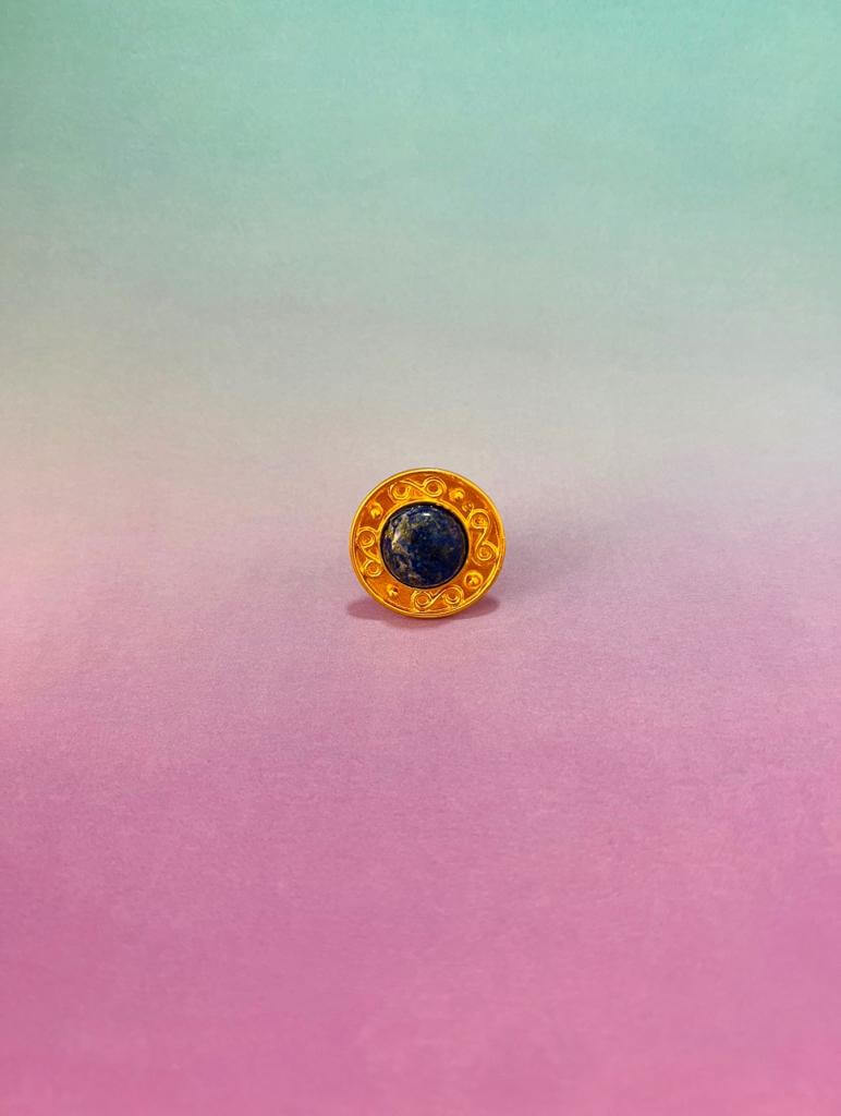 Anillo hecho bronce con enchape en oro de 24 kilates con arabescos y engaste en centro de piedras semipreciosas.