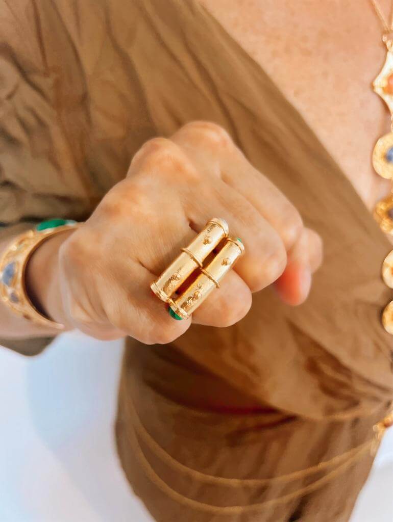 Hecho de doble barra de bronce con enchape en oro de 24 kilates y con engaste de piedras semipreciosas.