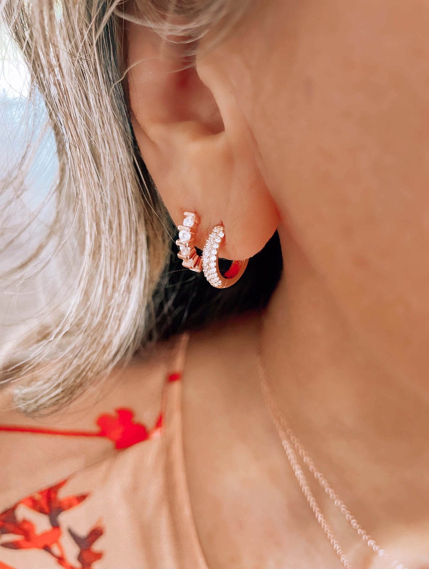 Tipo mini candongas hechas de plata 925 con enchape en oro de 24k, oro rosado y rodio y con engaste de circones.