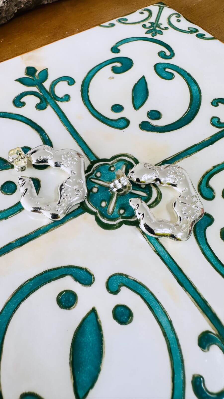 Aretes tipo candongas irregulares con arabescos hechas en bronce con enchape en plata de 3 cms de diámetro.