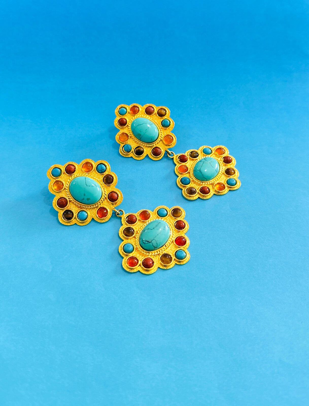 Aretes doble rombo hechos de bronce martillado con enchape en oro de 24 kilates y engaste de piedras semipreciosas.