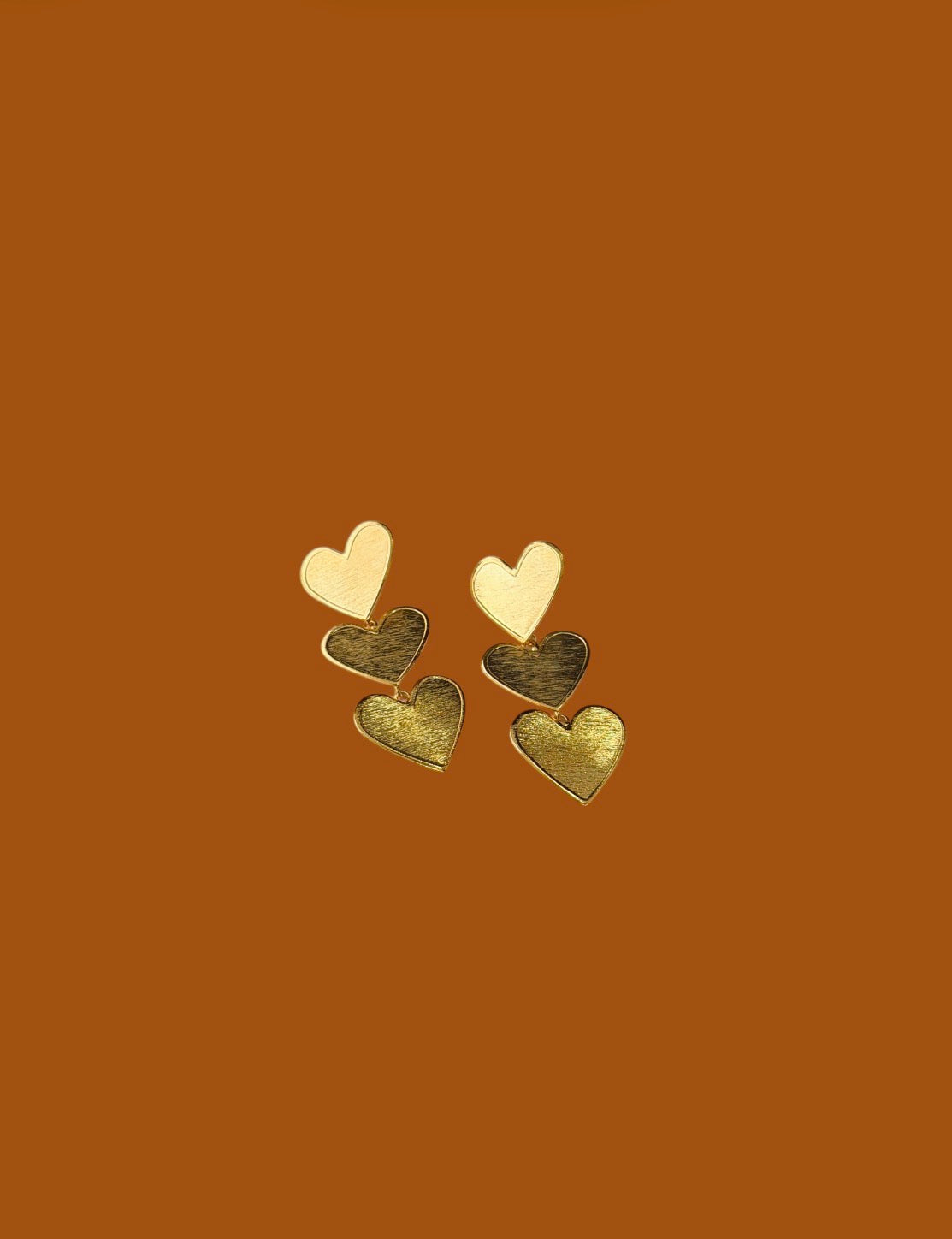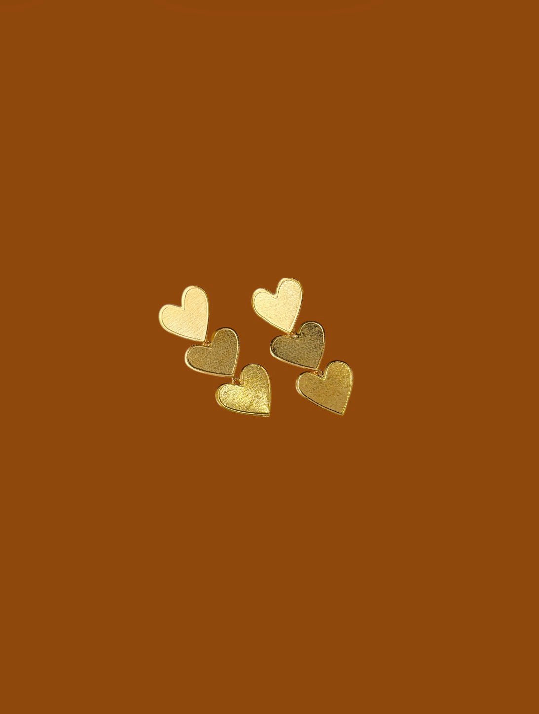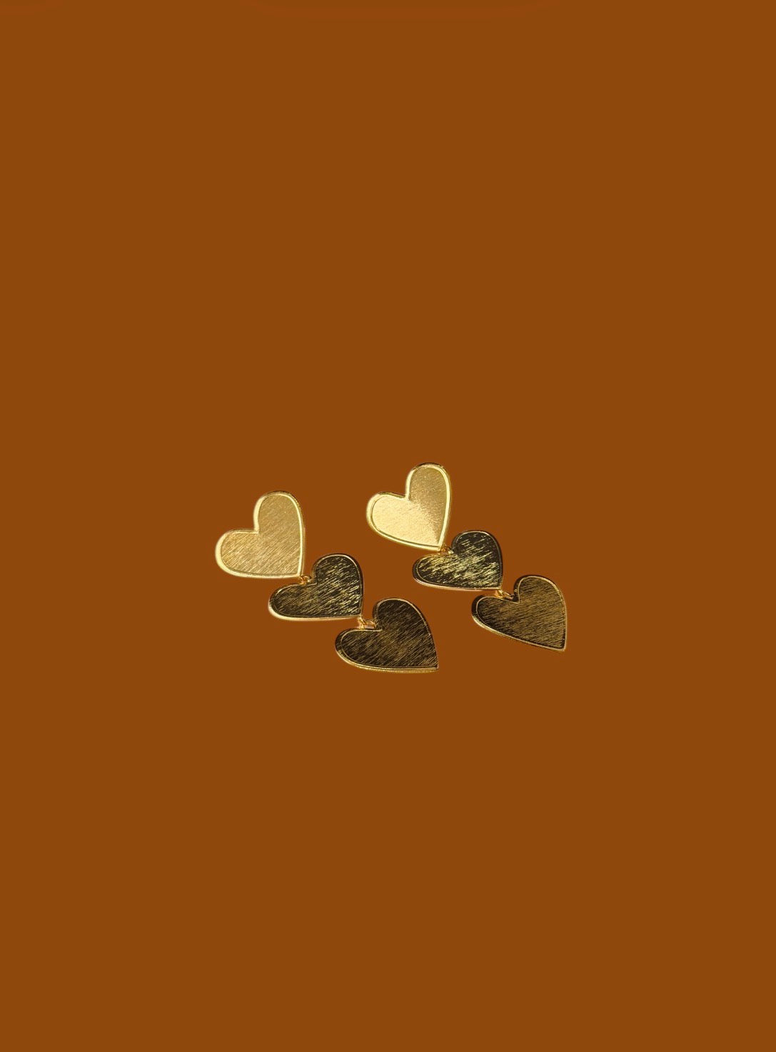 Aretes elaborados en bronce con enchape en oro de 24K, con diseño de corazones y acabado texturizado que refleja la luz de forma sutil. Una pieza femenina y atemporal, perfecta para usar todos los días.
