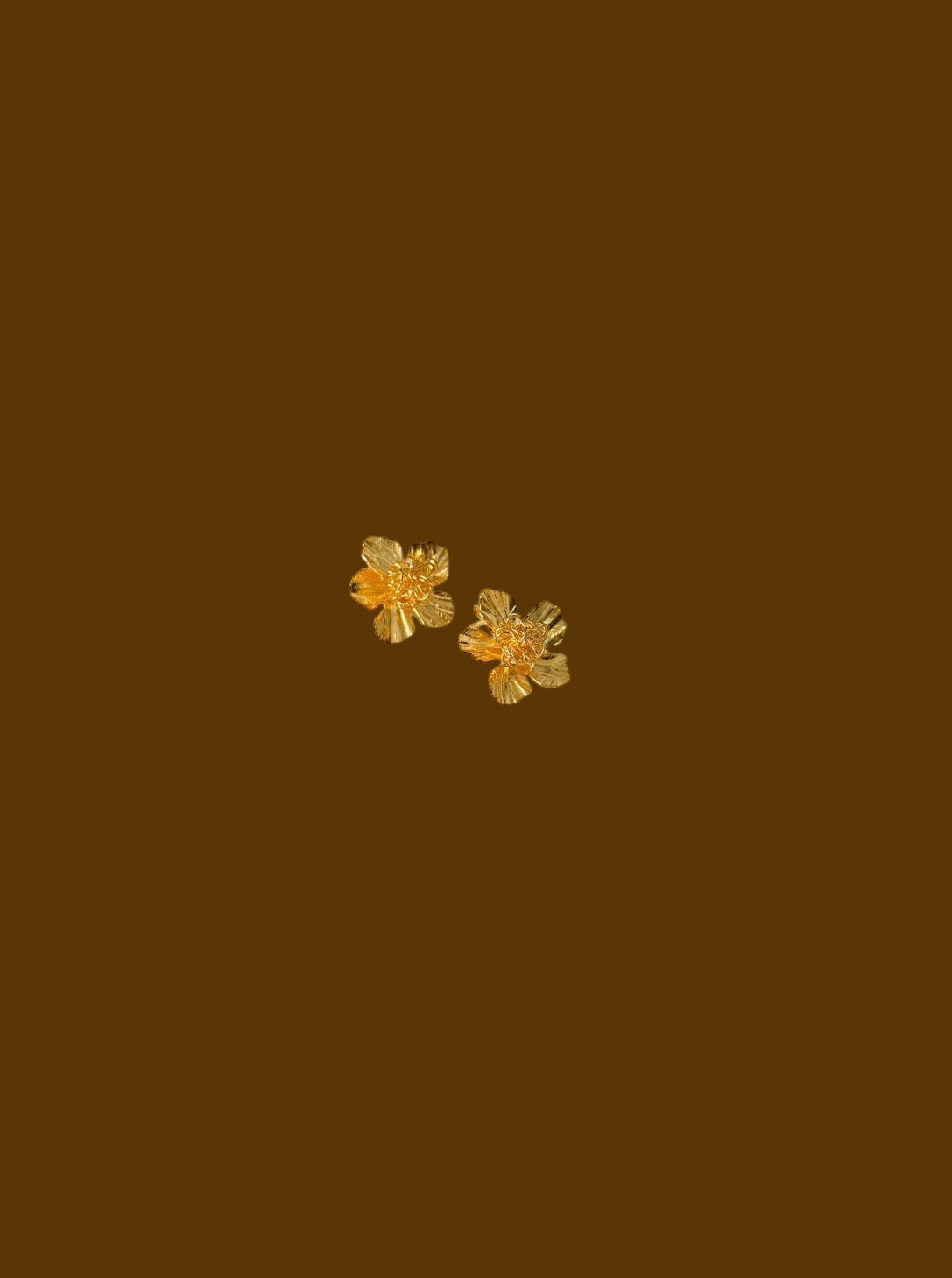 Aretes elaborados en bronce con enchape en oro de 24K, con un diseño radial y texturizado que evoca formas florales y juego de luces. Una pieza protagonista, sofisticada y con carácter.