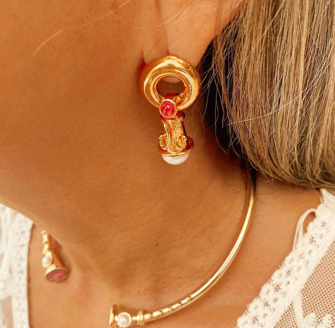Aretes compuestos por donna y péndulo hechos de bronce con enchape en oro de 24 kilates y con engaste de piedras semipreciosas y perla cultivada.