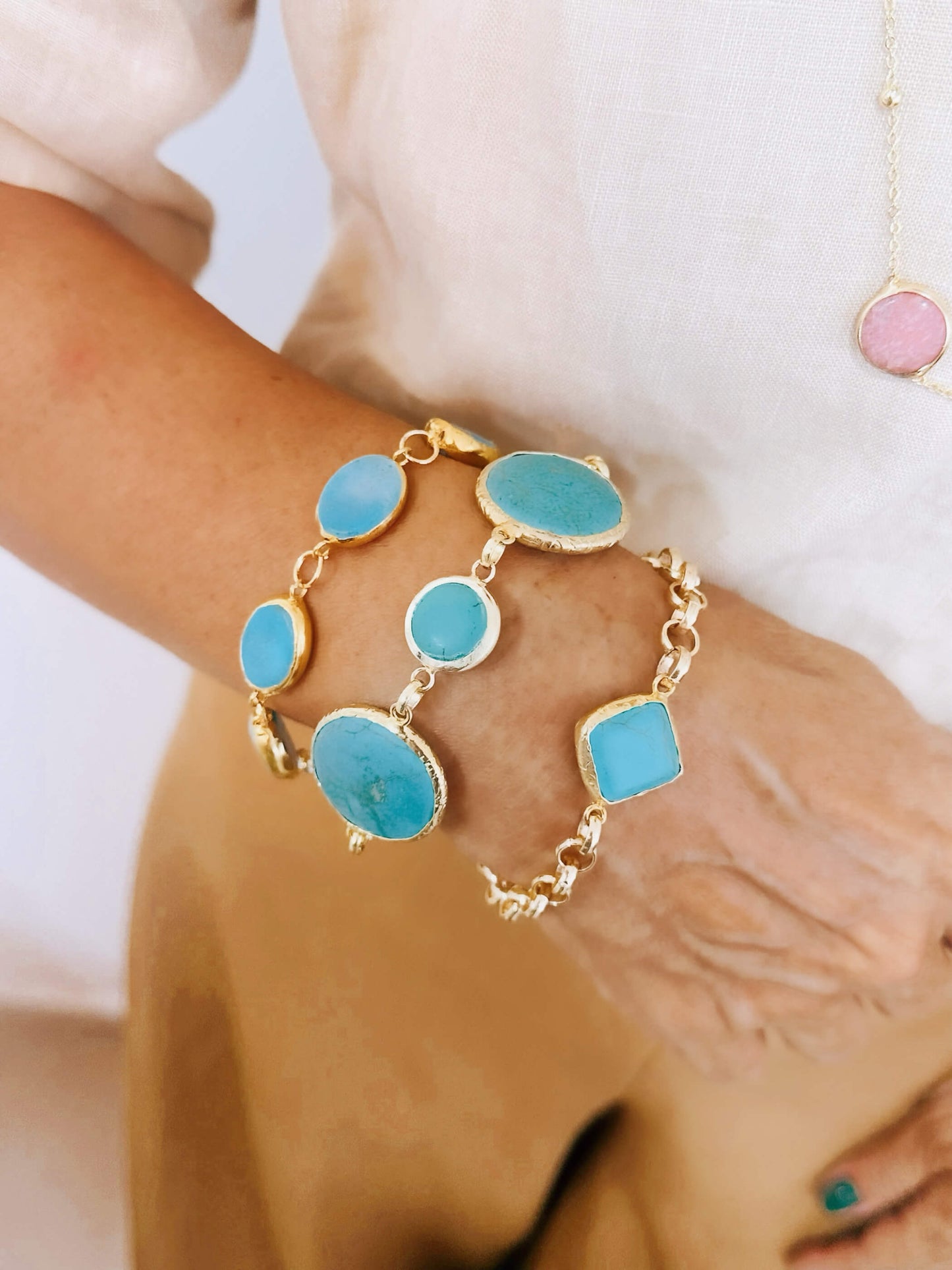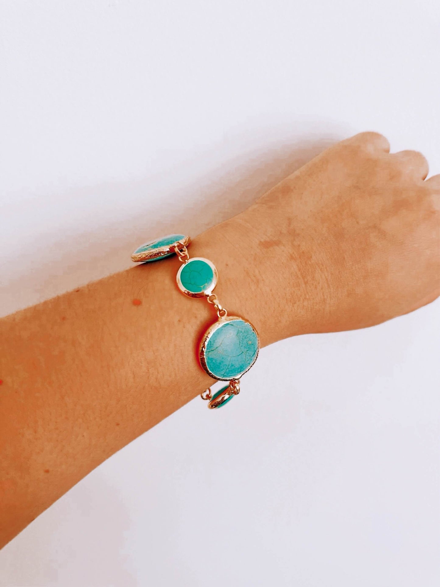 Pulsera hecha de eslabones enchapados en oro de 24k y turquesas de distintos tamaños con laminilla de oro en borde.