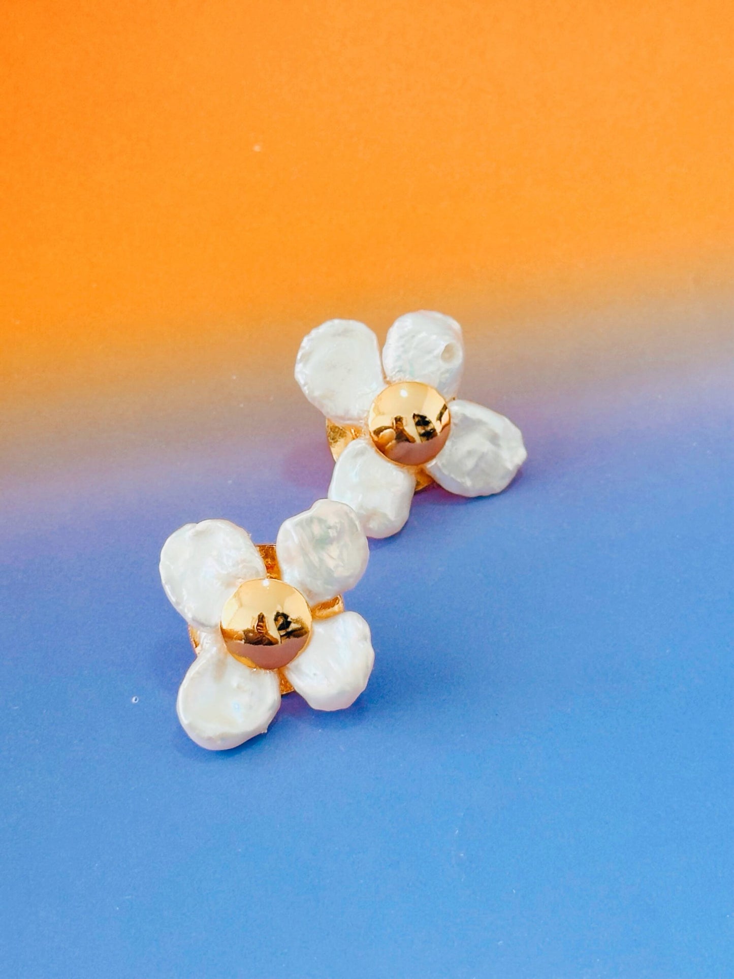 Aretes hechos a mano con perlas cultivadas keishi y botón en centro con topo de bronce con enchape en oro de 24k.