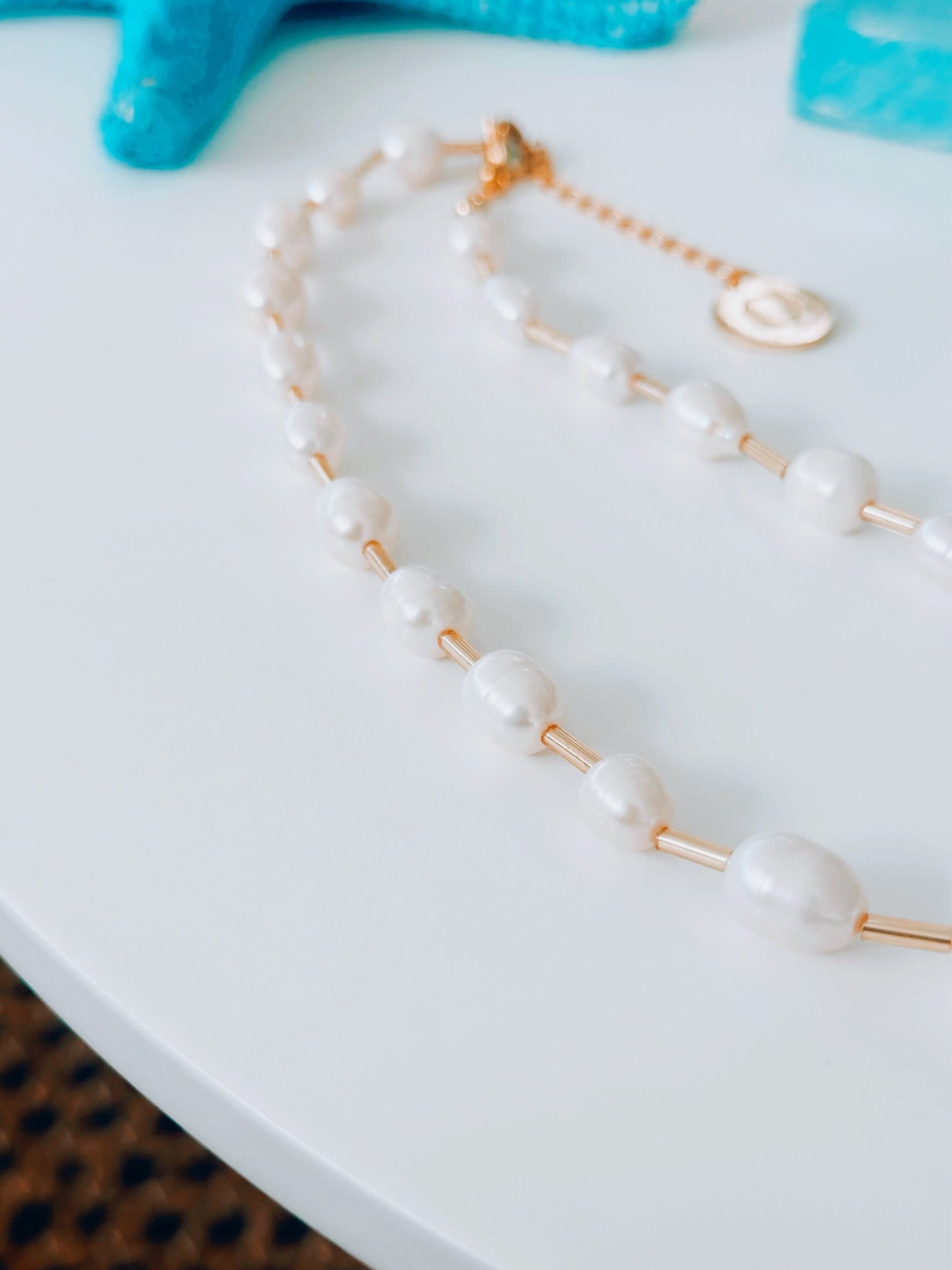 Gargantilla hecha de perlas cultivadas y tubos. Ajustable con cadena extensora.