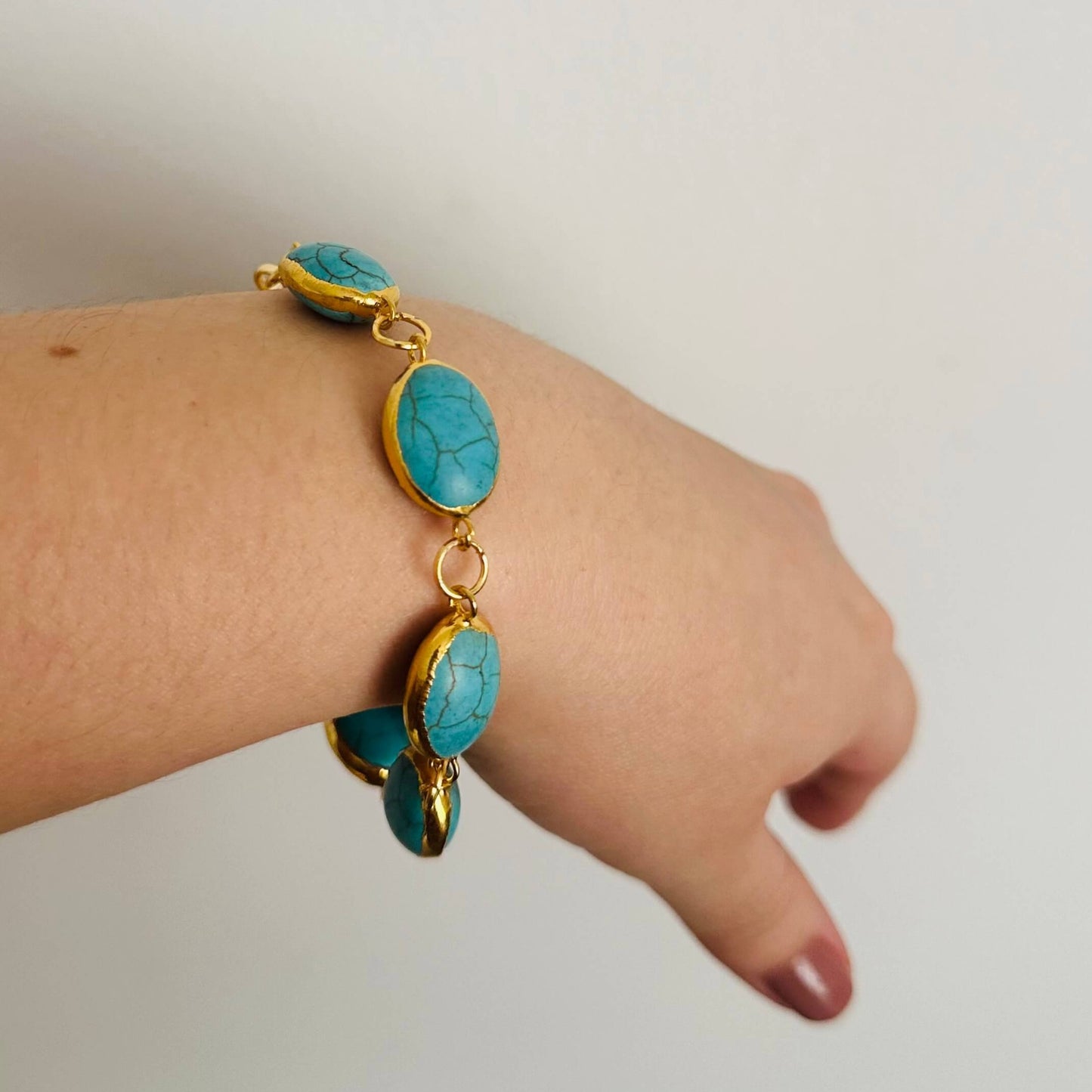 Pulsera hecha de bronce con enchape en oro de 24k y turquesas con laminilla de oro en el borde. Adicional con broche y cadena extensora.