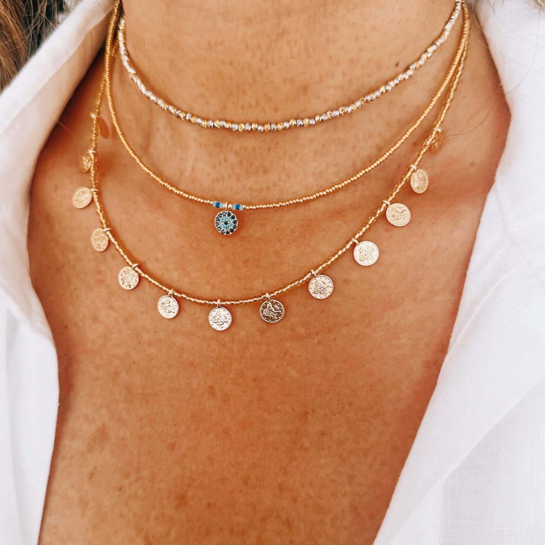 Collar hecho a mano con mostacilla dorada y mini monedas hechas en bronce con enchape en oro de 24k. Adicional cadena extensora para graduar.