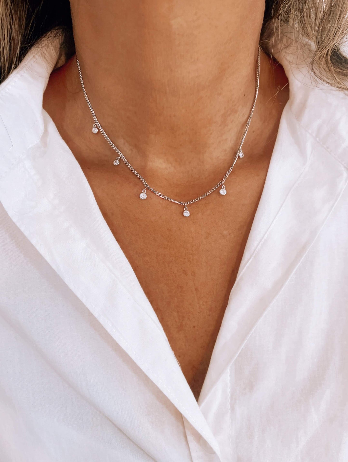 Collar de cadena de eslabones hecho en plata 925 con rodio y colgando con multiples dijes con engaste de circones.