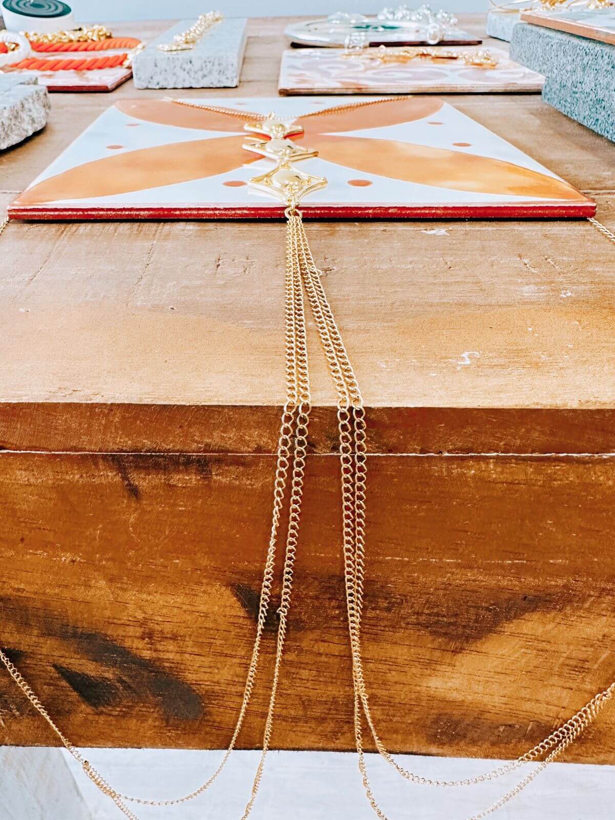 Tipo Body chain hecha de tres figuras distintas hechas en bronce con enchape en oro de 24k o plata y arabescos.