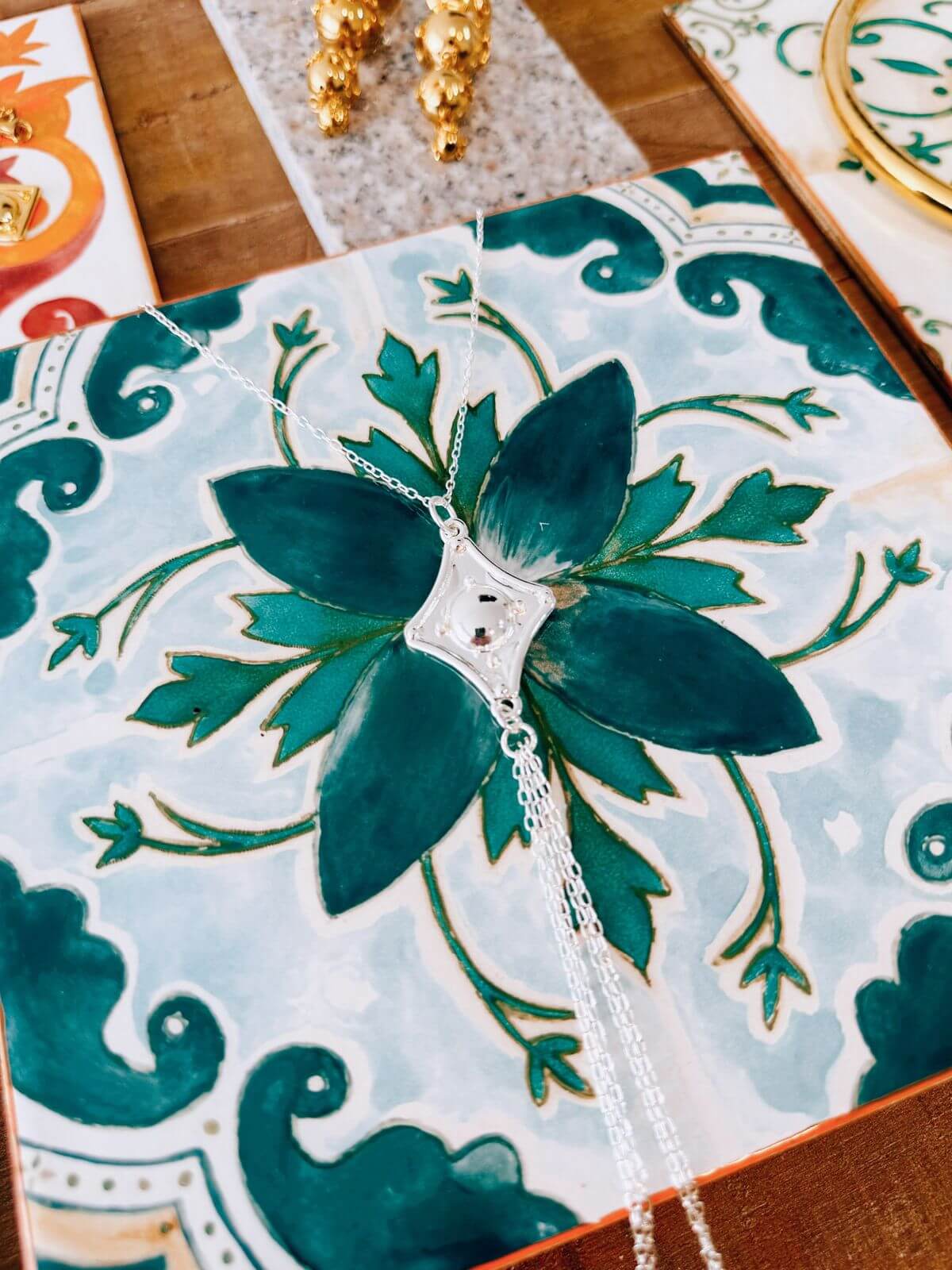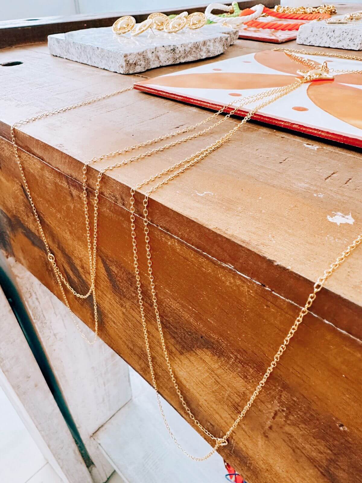 Collar tipo body chain hecho de una figura triangular hecha de bronce con enchape en oro de 24k o plata.