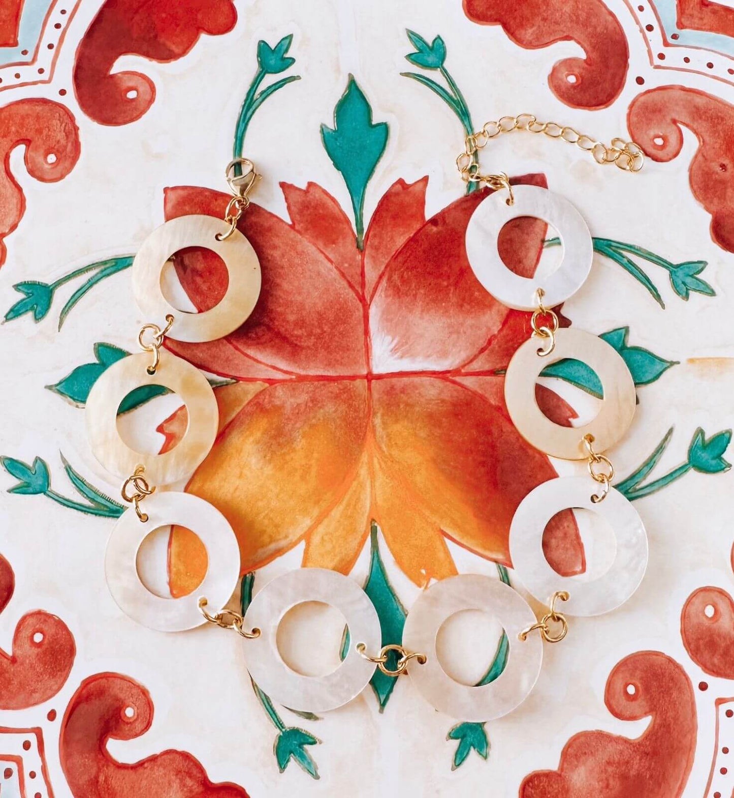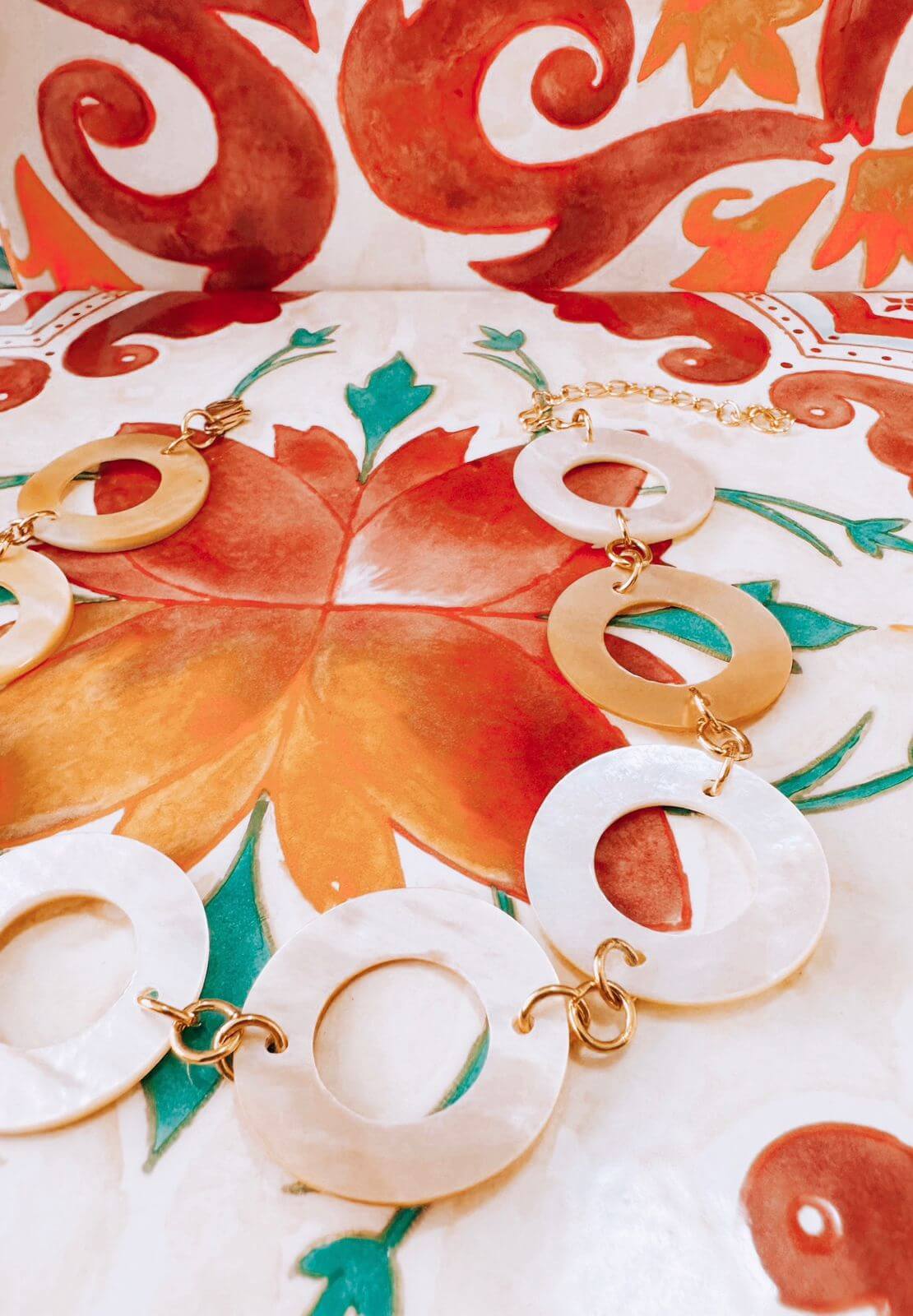 Collar tipo choker elaborado con donas de nácar de 4 cm de diámetro. Una pieza que combina textura y brillo natural para darle a tu look un toque elegante, moderno y lleno de carácter.
