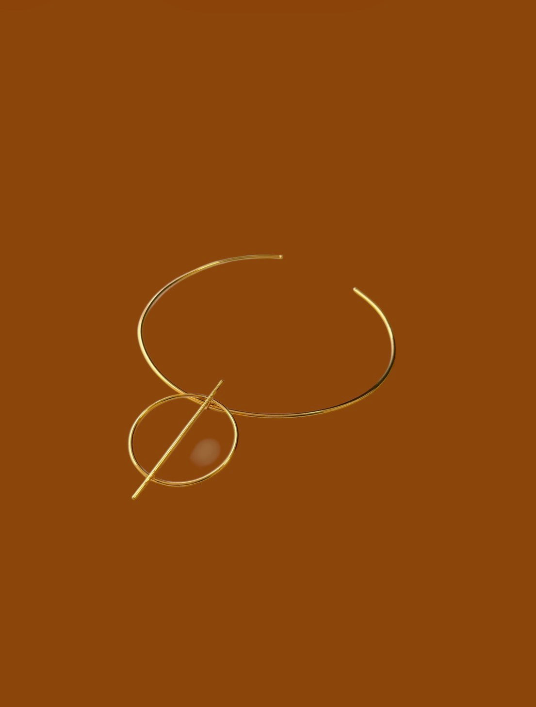 Choker en bronce con enchape en oro de 24K, de estructura limpia y formas geométricas que crean un equilibrio visual elegante y minimal. Un diseño protagonista con carácter contemporáneo.