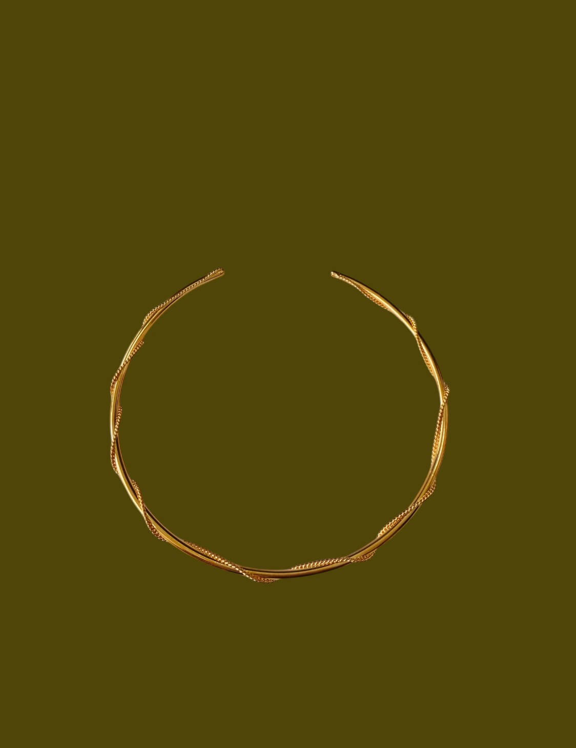Choker en hilo y alambre con enchape en oro de 24K, donde las formas fluidas y texturas sutiles crean un efecto artesanal y sofisticado.