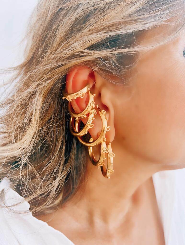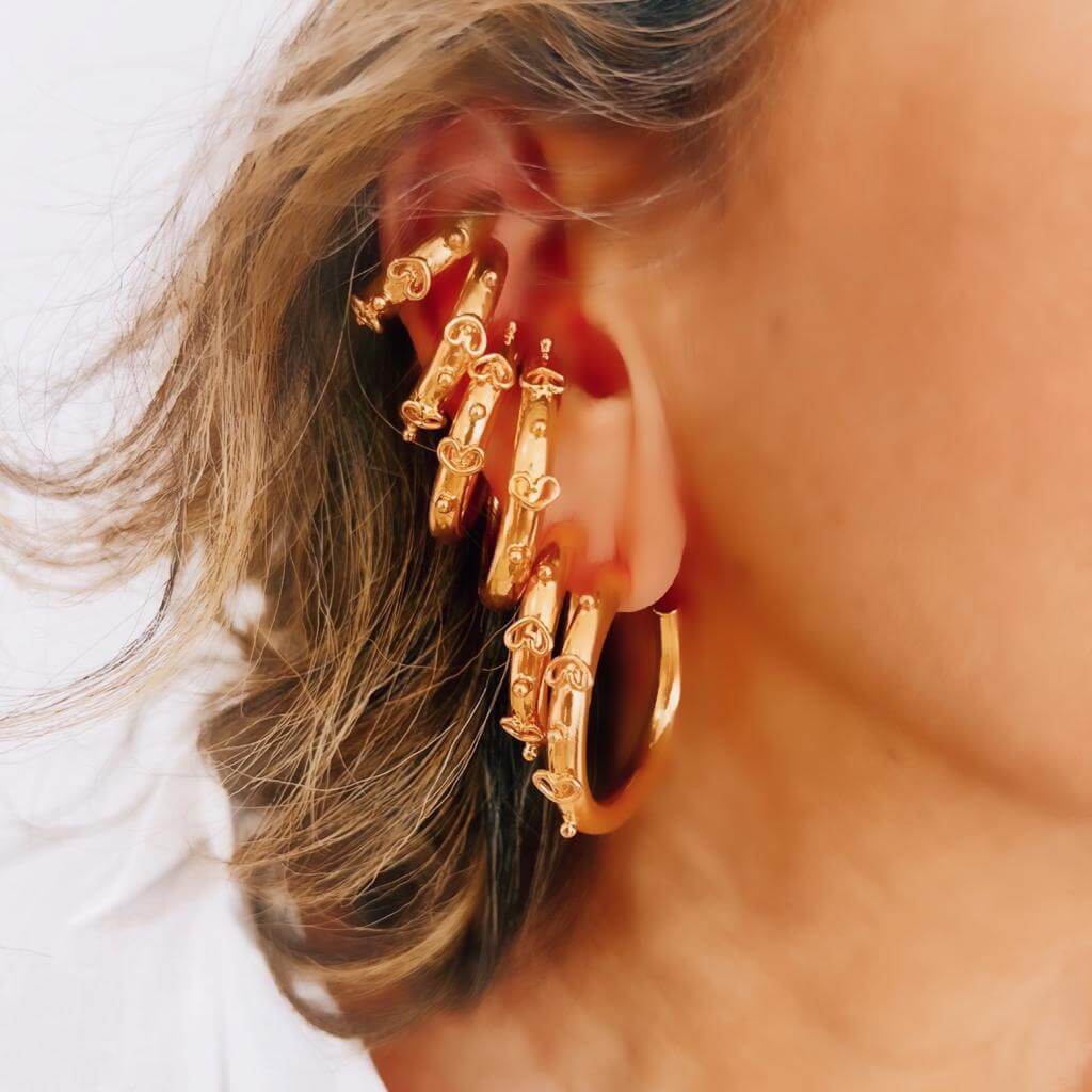 Ear cuff o orejera hecha de bronce con arabescos y con enchape en oro de 24 kilates.
