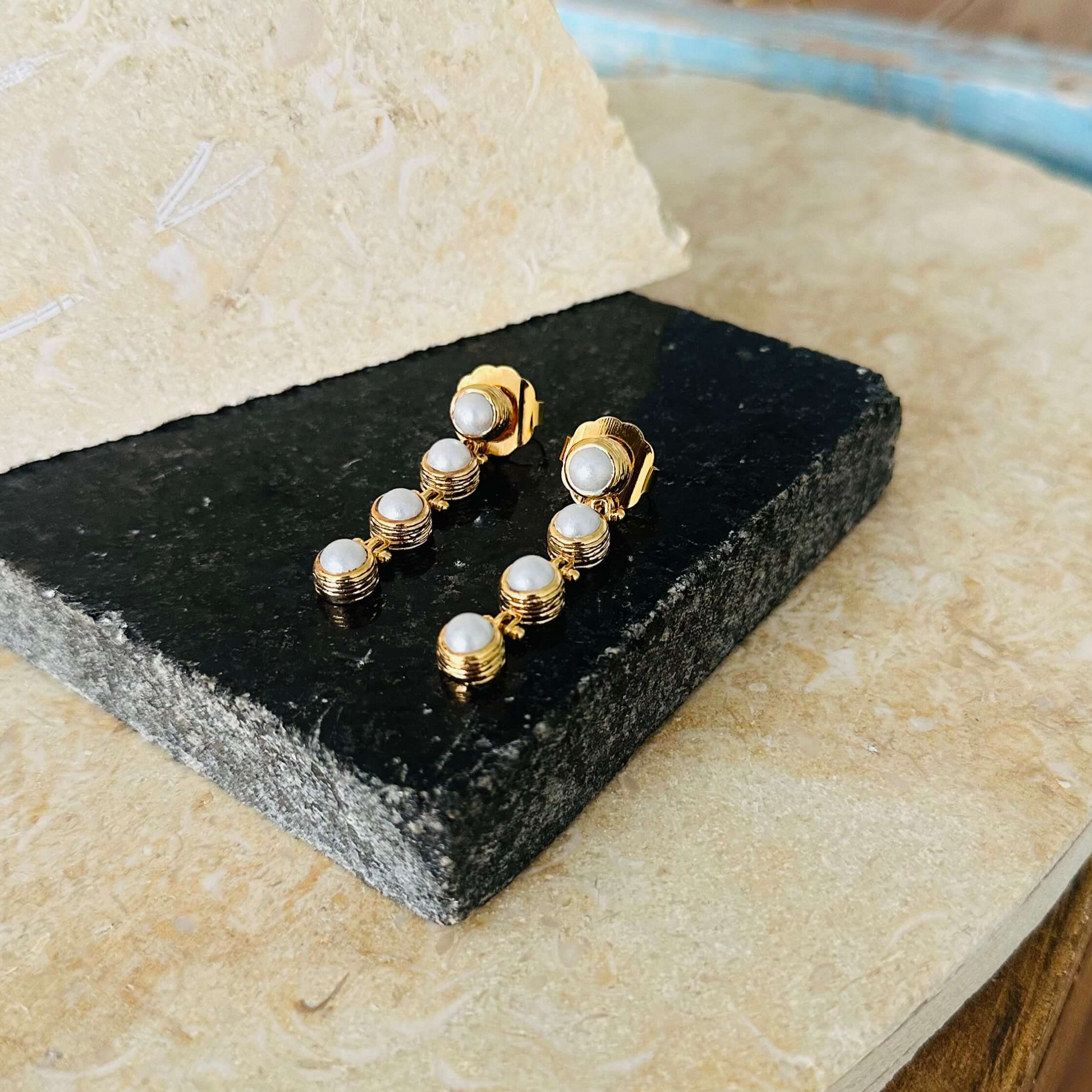 Aretes largos hechos a mano de bronce con enchape en oro de 24k y con engaste de perlas de agua dulce.