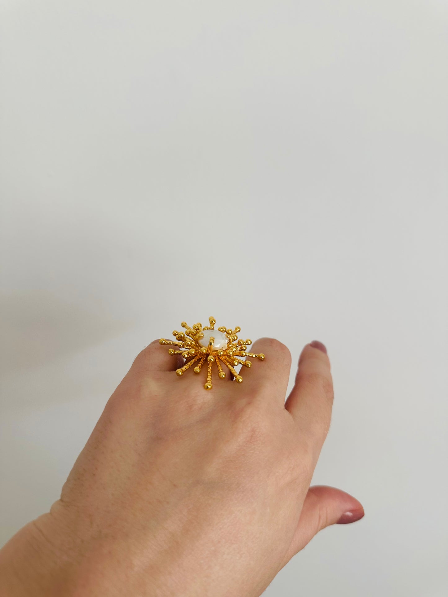 Anillo hecho a mano de bronce con enchape en oro de 24k y con centro de perla japonesa cultivada.