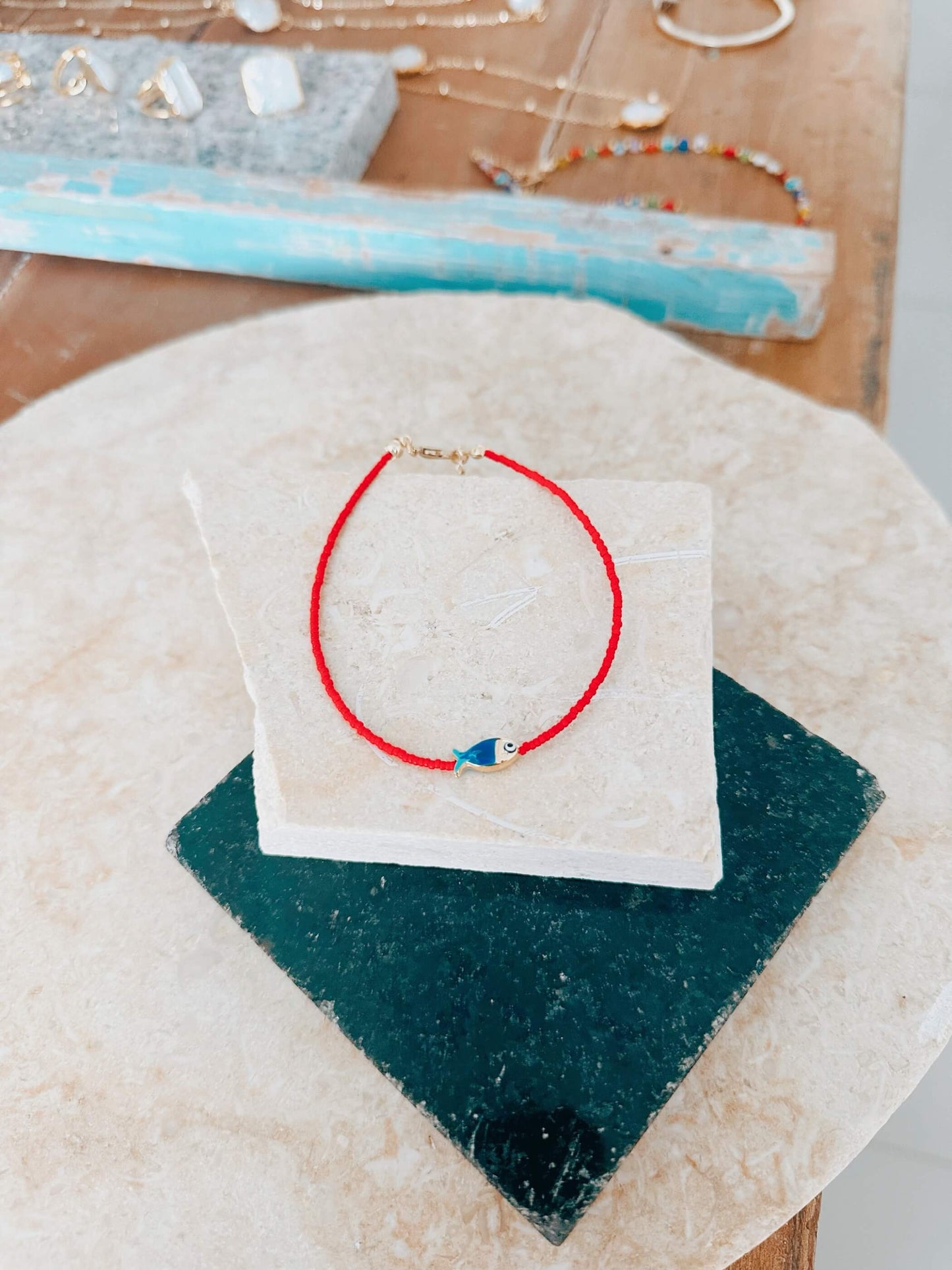 Pulsera hecha con mini mostacillas y dije de pescado hecho de bronce con enchape en oro de 24k esmaltado.
