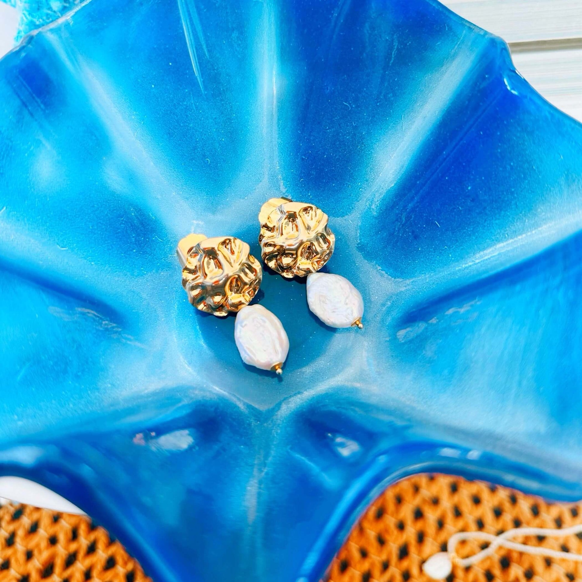 Topos deformes enchapados en oro de 24k adornados con una perla barroca japonesa cultivada.