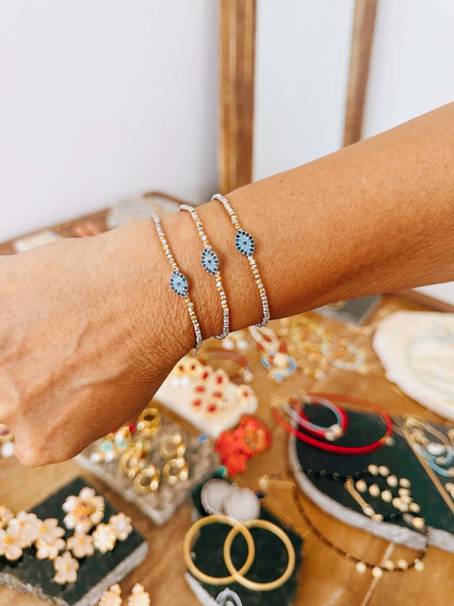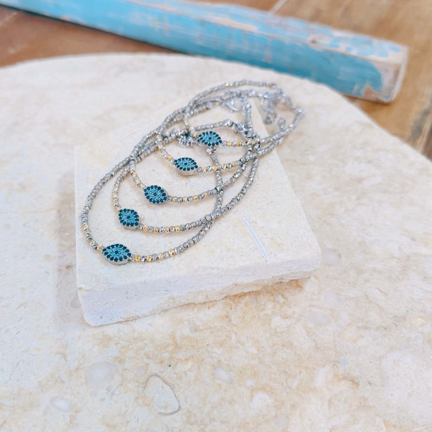 Pulsera hecha a mano con mini cristales plateados, dorados y rosados y centro con "ojito" hecho con rodio y circones. Adicional cadena extensora para graduar.