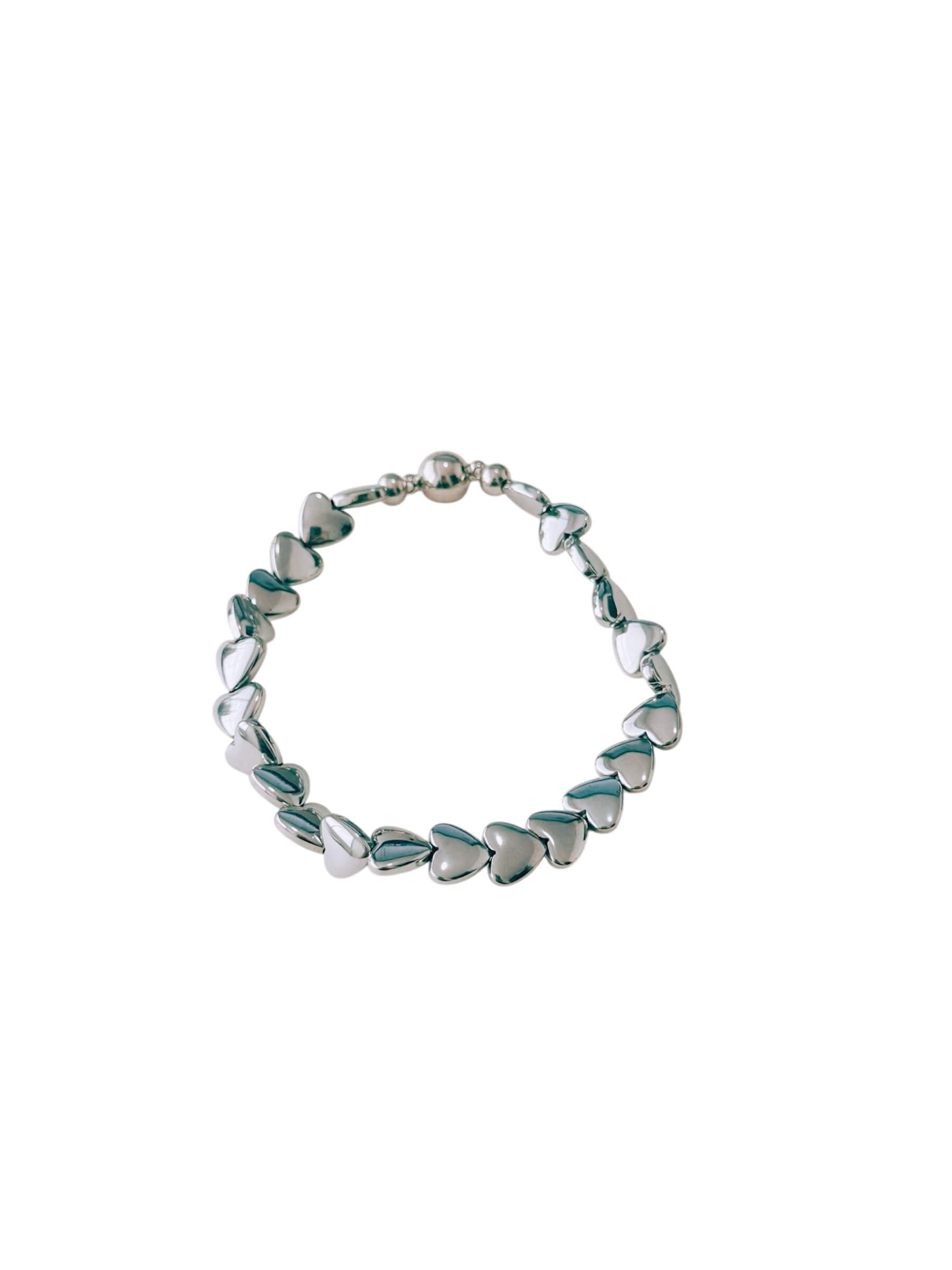 Pulsera de corazones de acerina plateado, con broche imantado para un cierre práctico y lleno de encanto.
