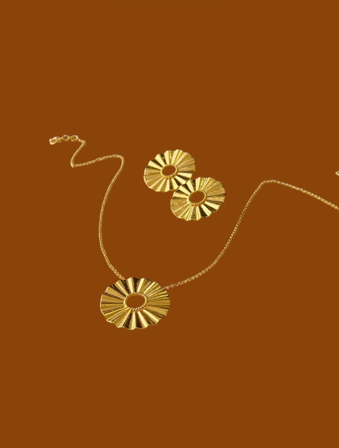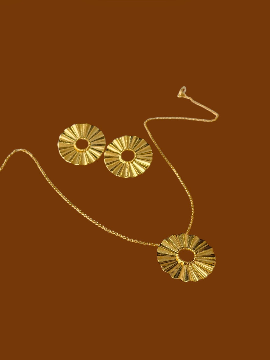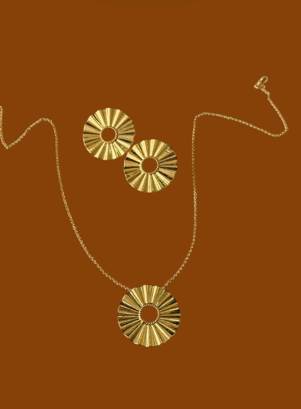 Juego de aretes y collar elaborado en bronce con enchape en oro de 24K, con un diseño circular de textura radial que aporta brillo y carácter. Un set sofisticado y atemporal, ideal para usar junto o por separado.