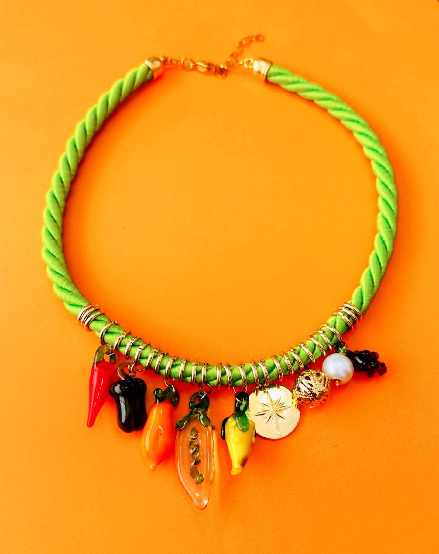 Collar de cordón verde con argollas, charms enchapados en oro de 24k, perlas, frutas y ojitos. ¡Una fiesta de colores y estilo en un solo accesorio!