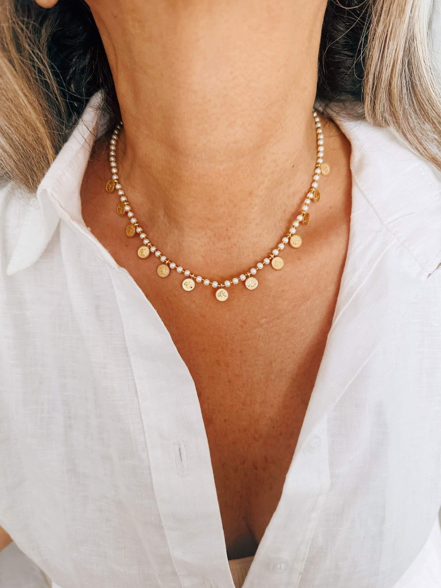 Collar hecho a mano con mini perlas de agua dulce y mini monedas hechas en bronce con enchape en oro de 24k. Adicional cadena extensora para graduar.