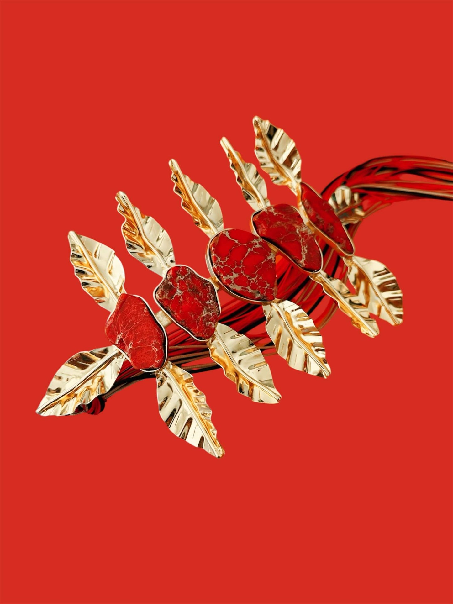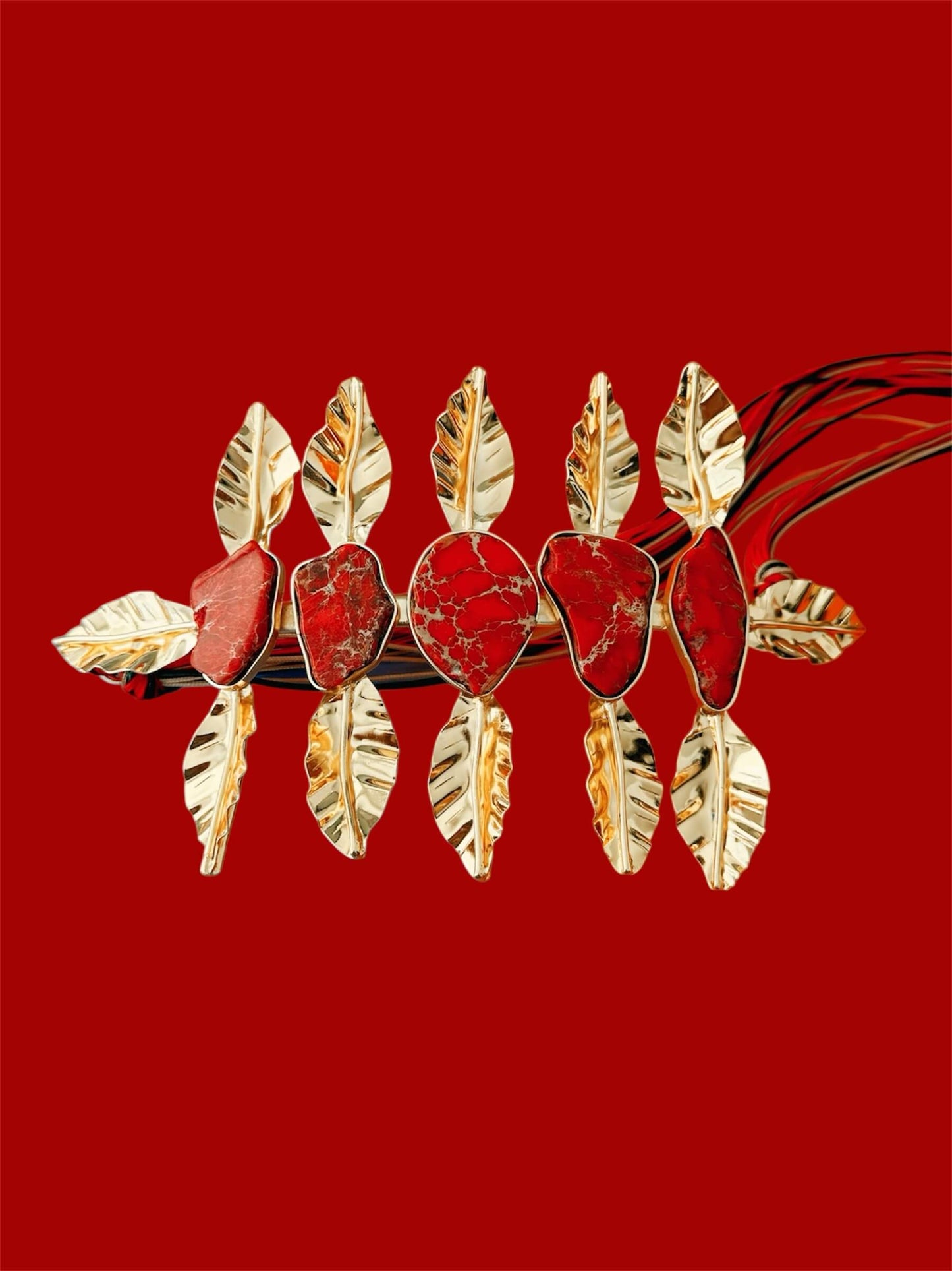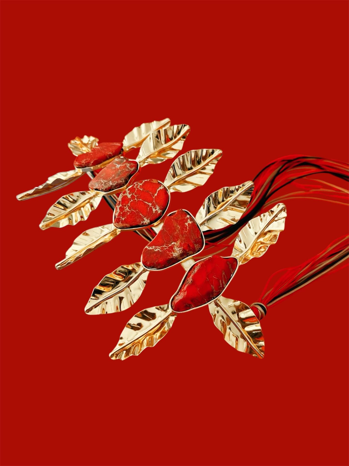 Un cinturón que trasciende su función para convertirse en una pieza de arte. Forjado en metal con una silueta orgánica y fluida que abraza el cuerpo con naturalidad. Cada curva ha sido cuidadosamente diseñada, luego enchapada en oro de 24k para reflejar luz y movimiento. Las ágatas, engastadas una a una, aportan textura, color y fuerza simbólica. Esta pieza es una declaración: de estilo, de identidad, de historia.
