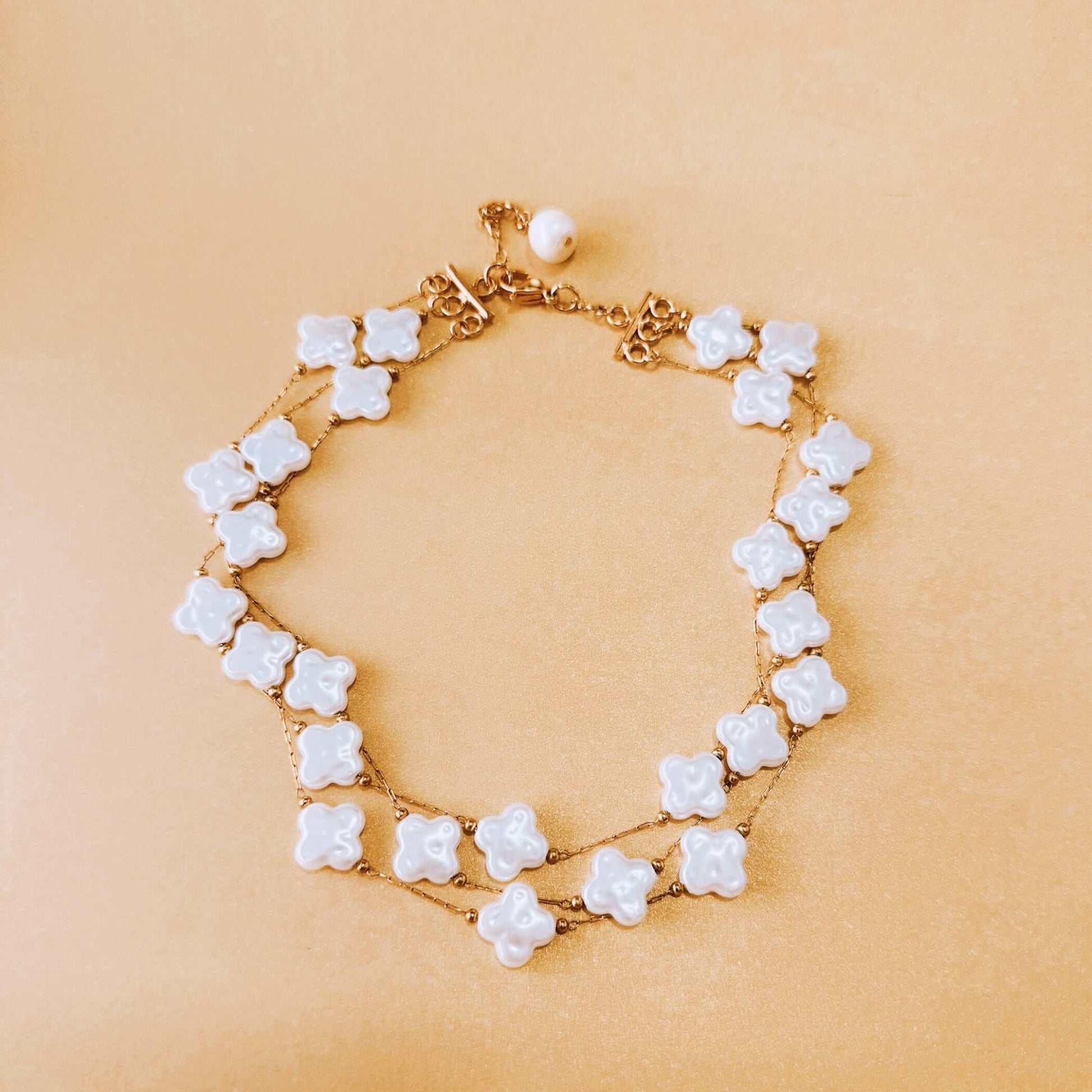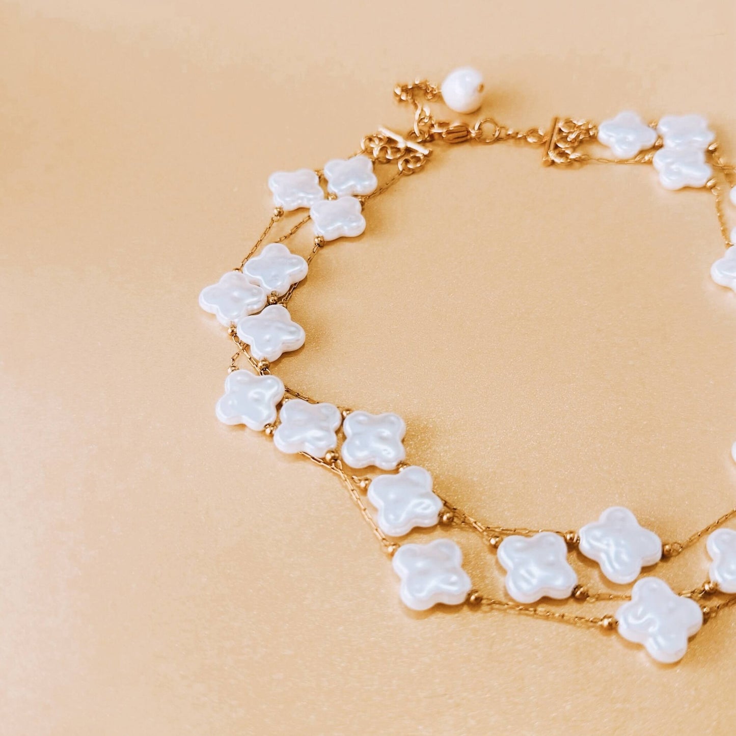 Collar tipo gargantilla ajustado al cuello, elaborado con cadena enchapada en oro de 24k y decorado con perlas shell en forma de flor intercaladas. El diseño cuenta con tres niveles y una cadena extensora para un ajuste perfecto.