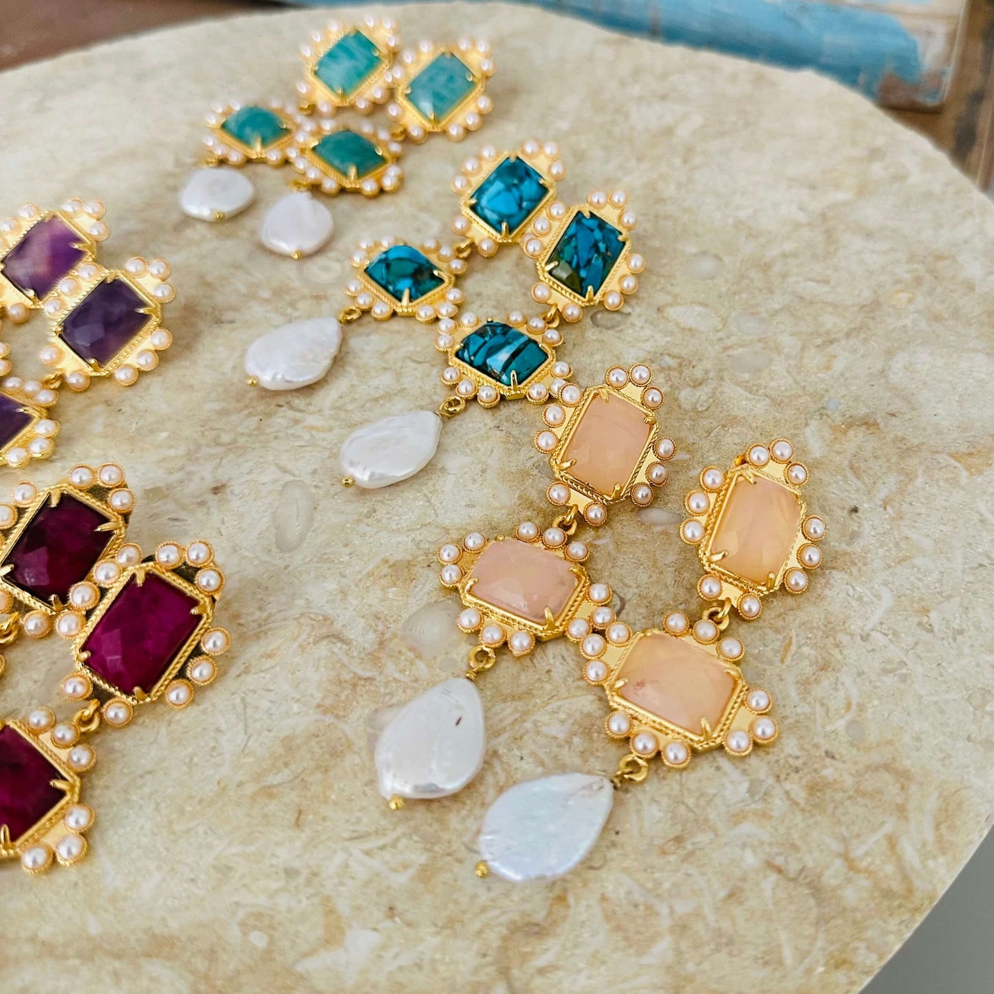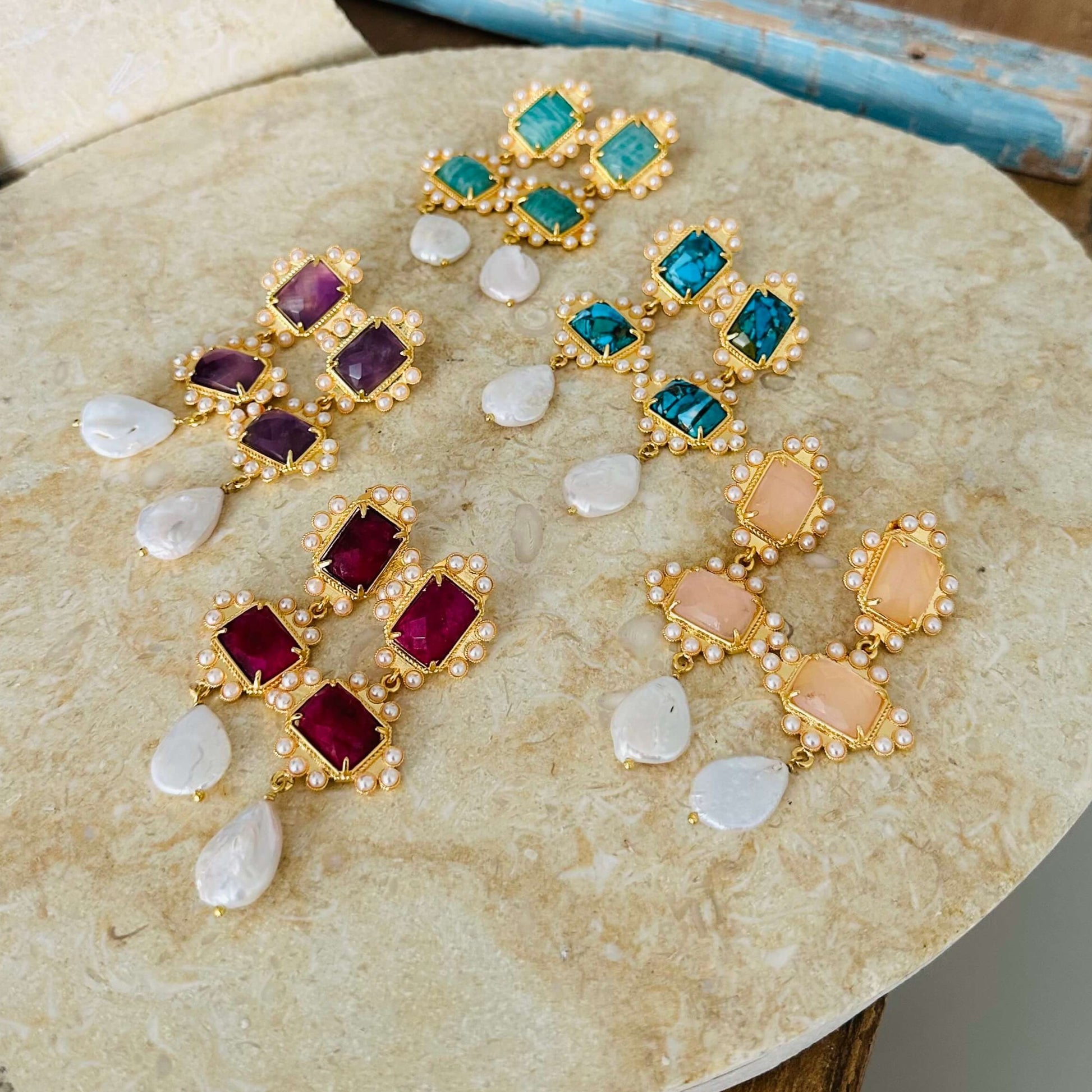 Aretes dobles hechos a mano de bronce con enchape en oro de 24k y con engaste de perlas de agua dulce y piedras semipreciosas. También colgando una perla japonesa cultivada.