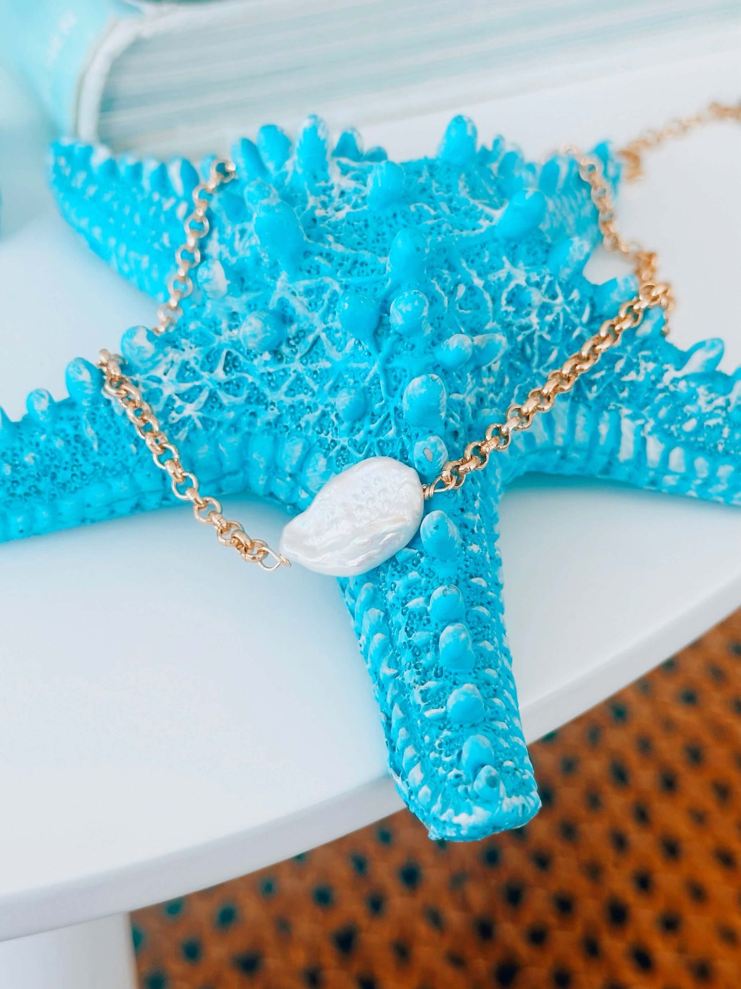 Cadena y broche enchapados en oro de 24 quilates, broche timón y con perla japonesa cultivada colgando. Lo puedes usar tipo choker o gargantilla.