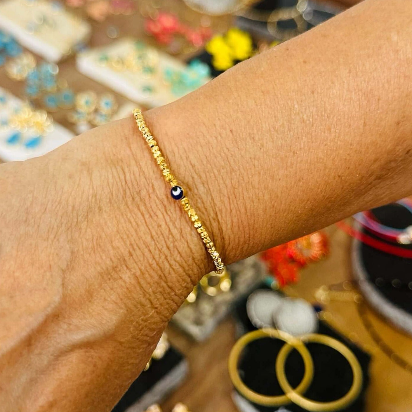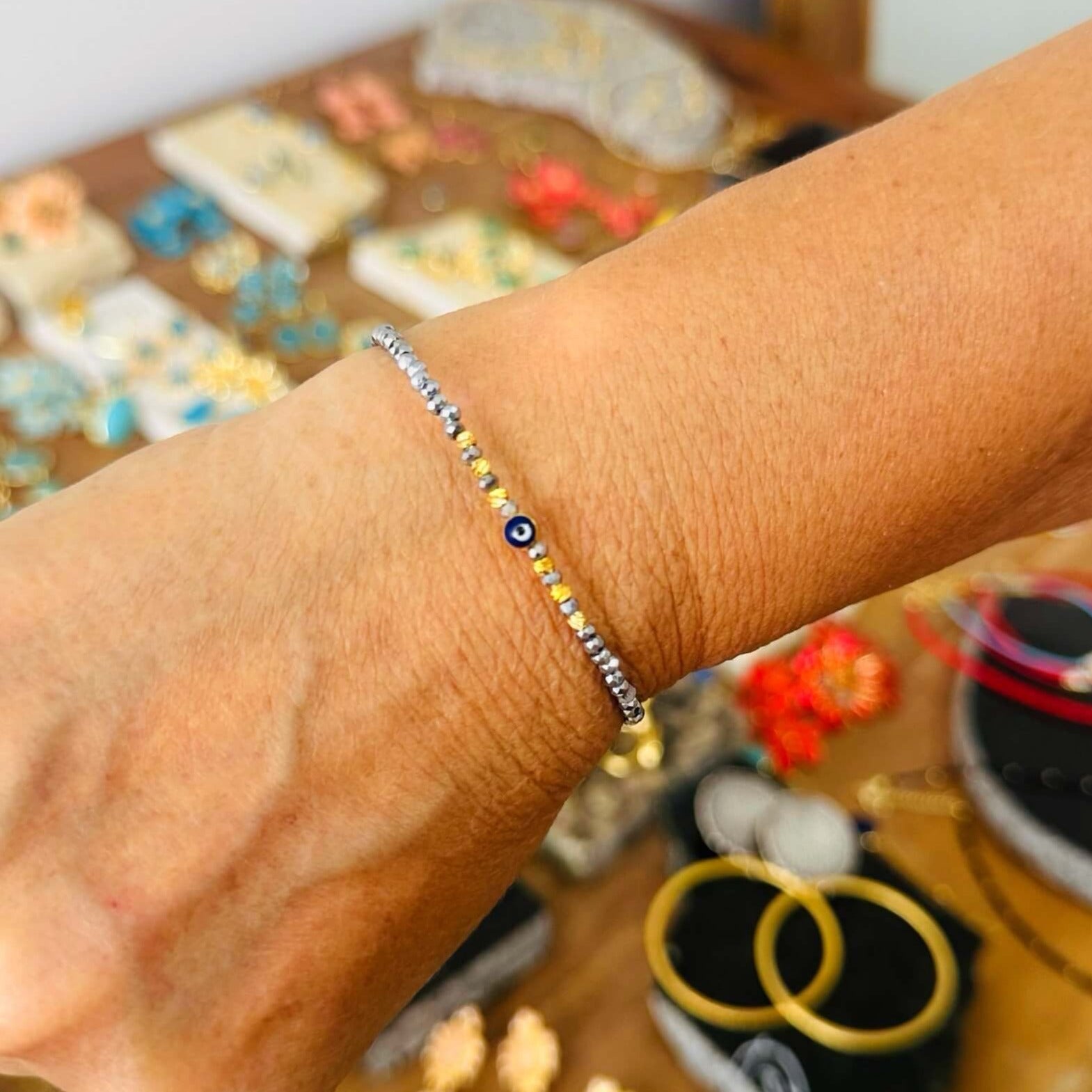 Pulsera hecha a mano con mini cristales plateados, dorados y rosados y centro con "ojito" hecho en vidrio esmaltado horneado. Adicional cadena extensora para graduar.