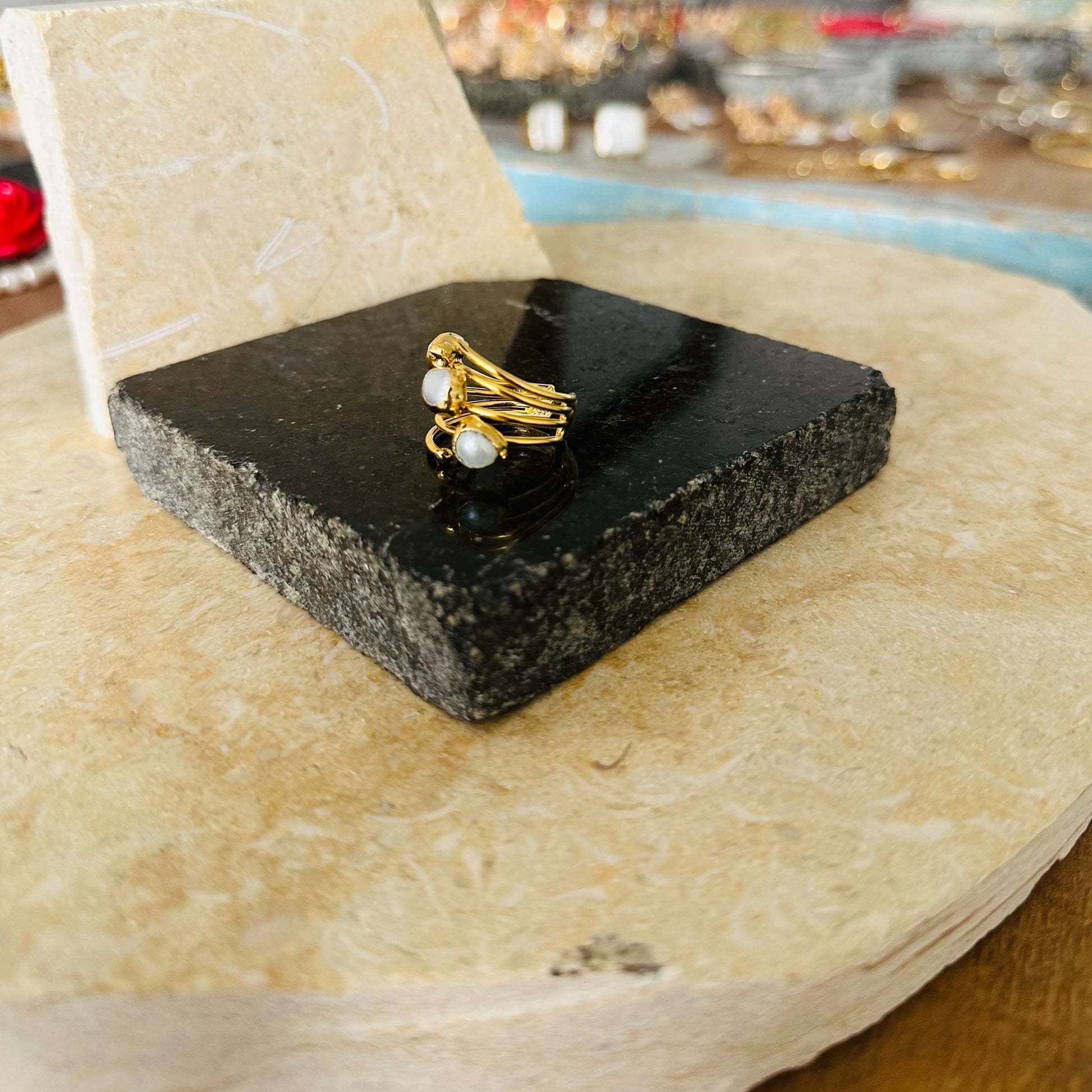 Anillo en forma de espiral hecho a mano de bronce con enchape de oro de 24k y mini perlas japonesas cultivadas engastadas.