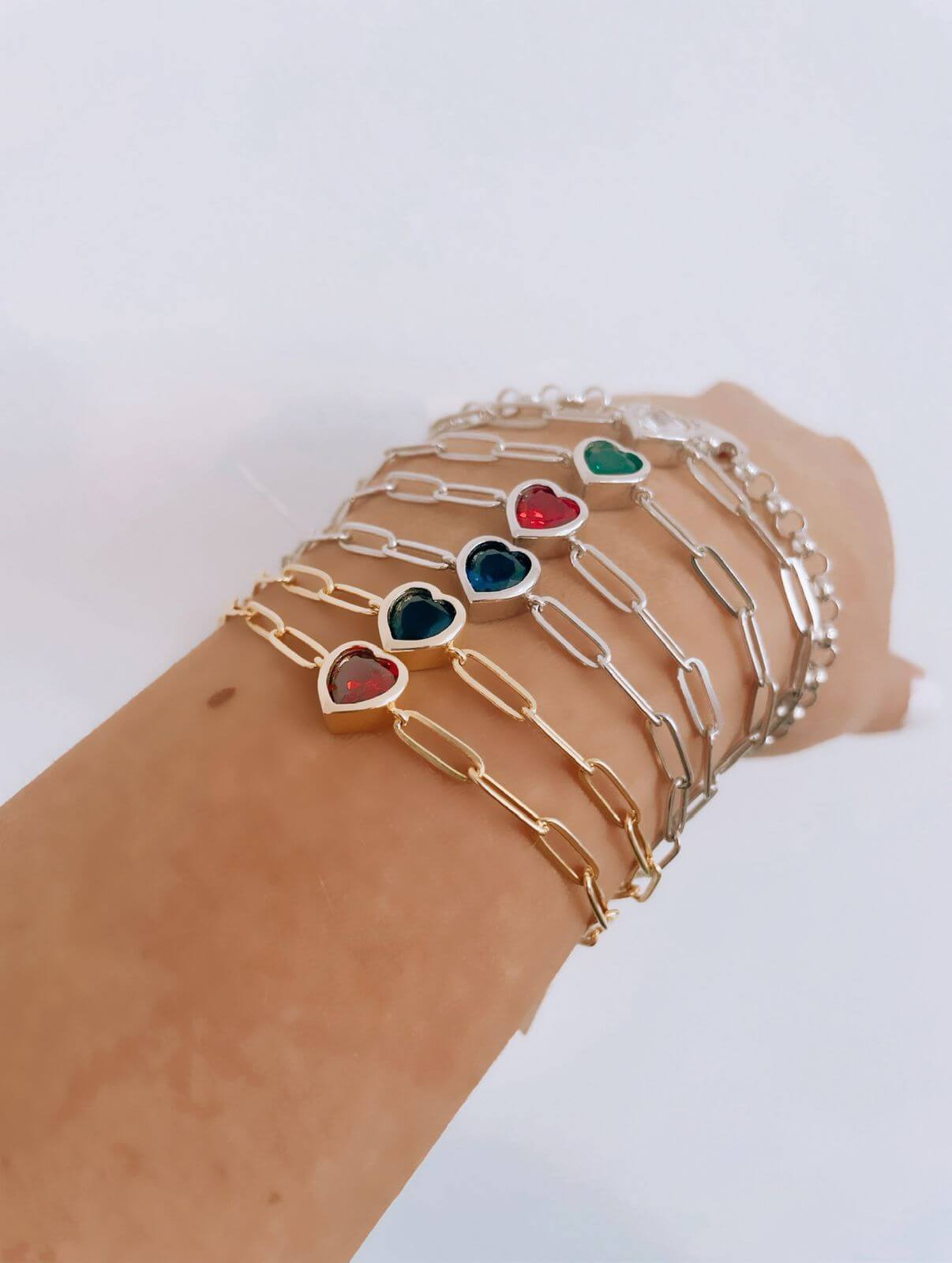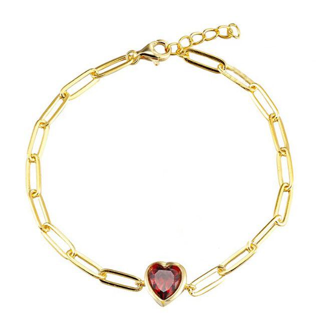 Pulsera de eslabones con dije de corazón de circón unicolor hecha en plata 925 con baño en oro de 24k.