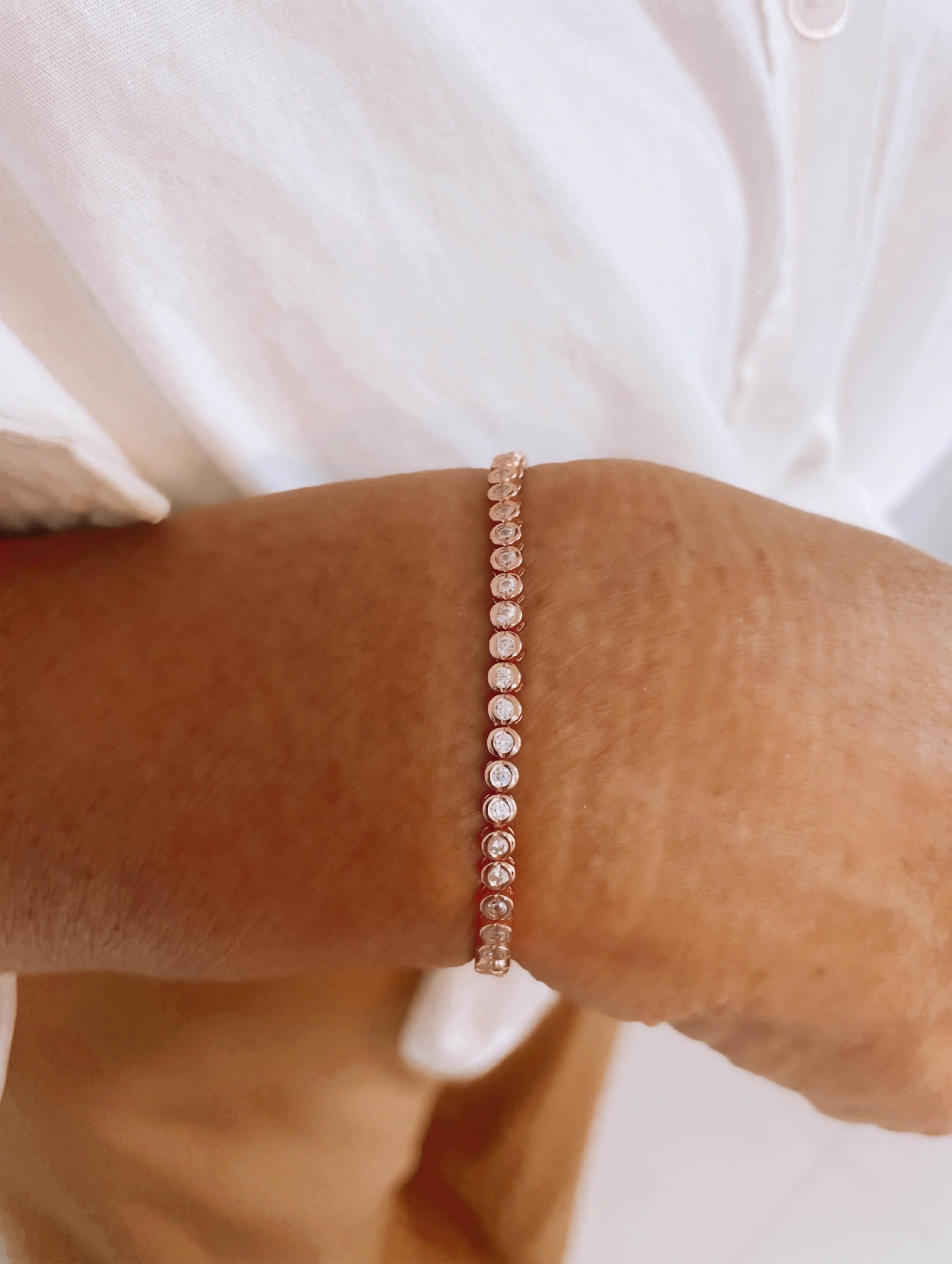 Pulsera tipo tennis hecha en plata 925 con enchape en oro de 24k, rodio u oro rosado y con engaste de circones circulares. Ajustable.