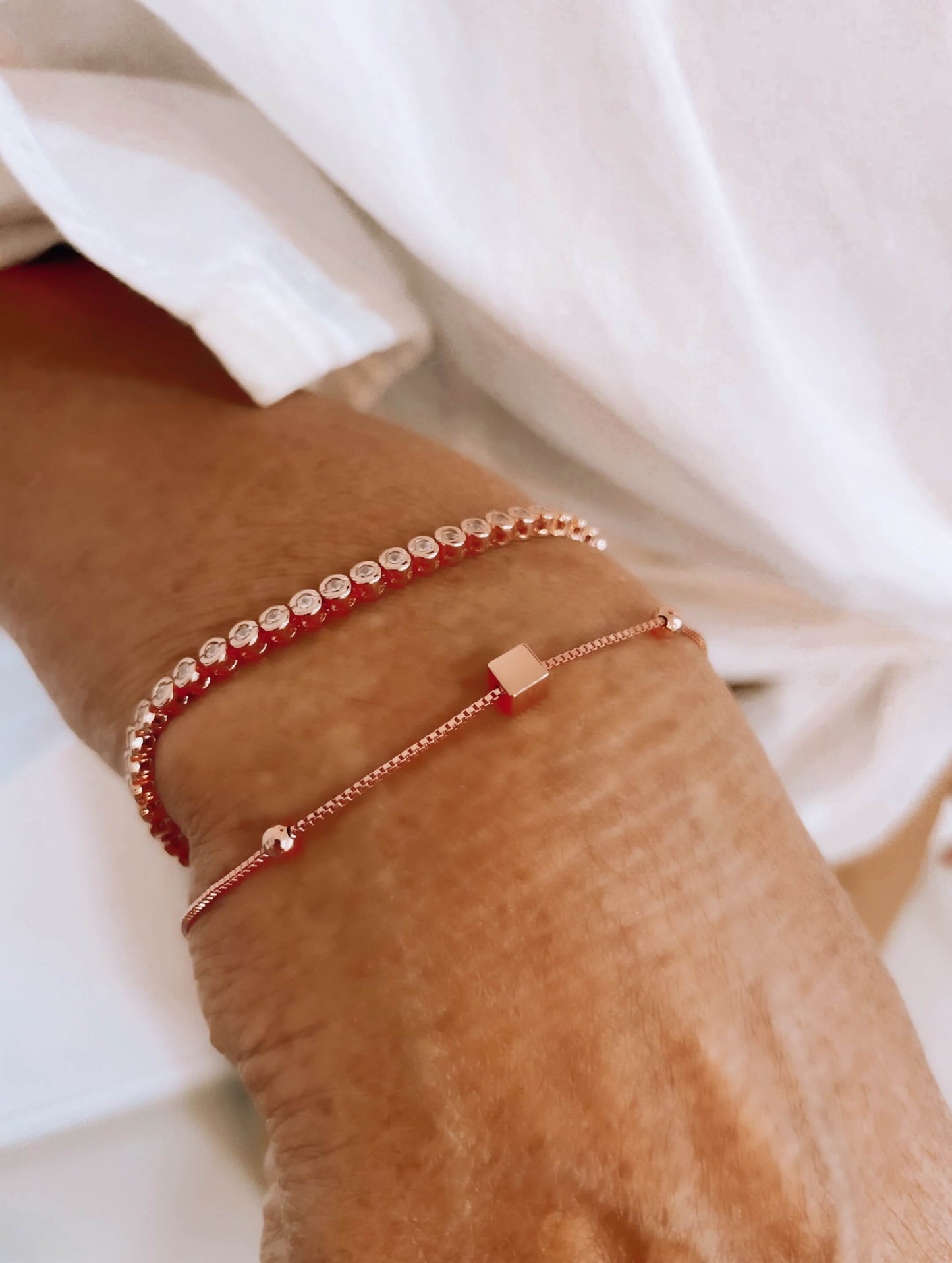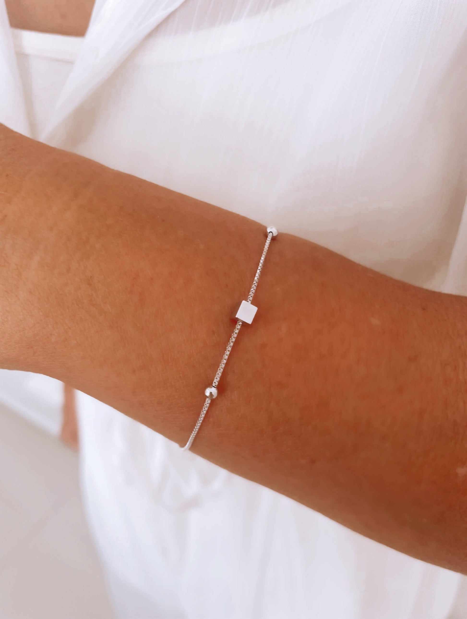 Pulsera hecha en plata 925 con enchape en oro de 24k, rodio u oro rosado y dijes de cubos. Ajustable.