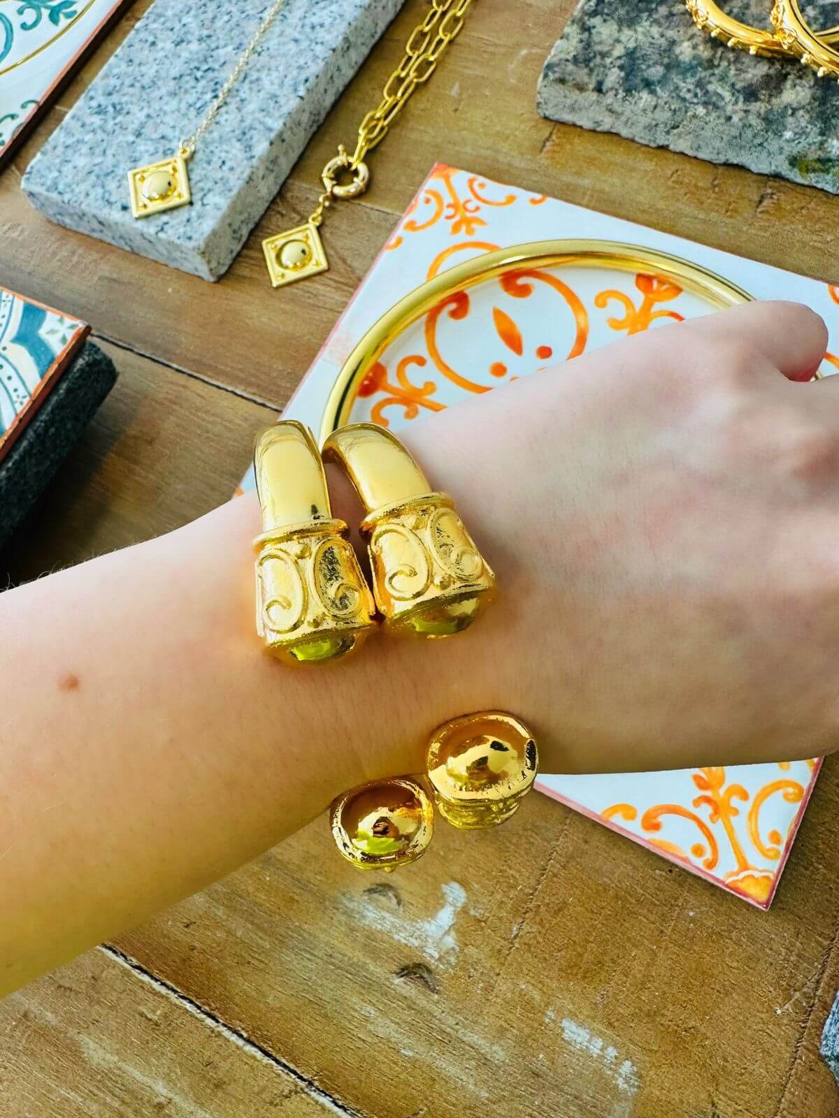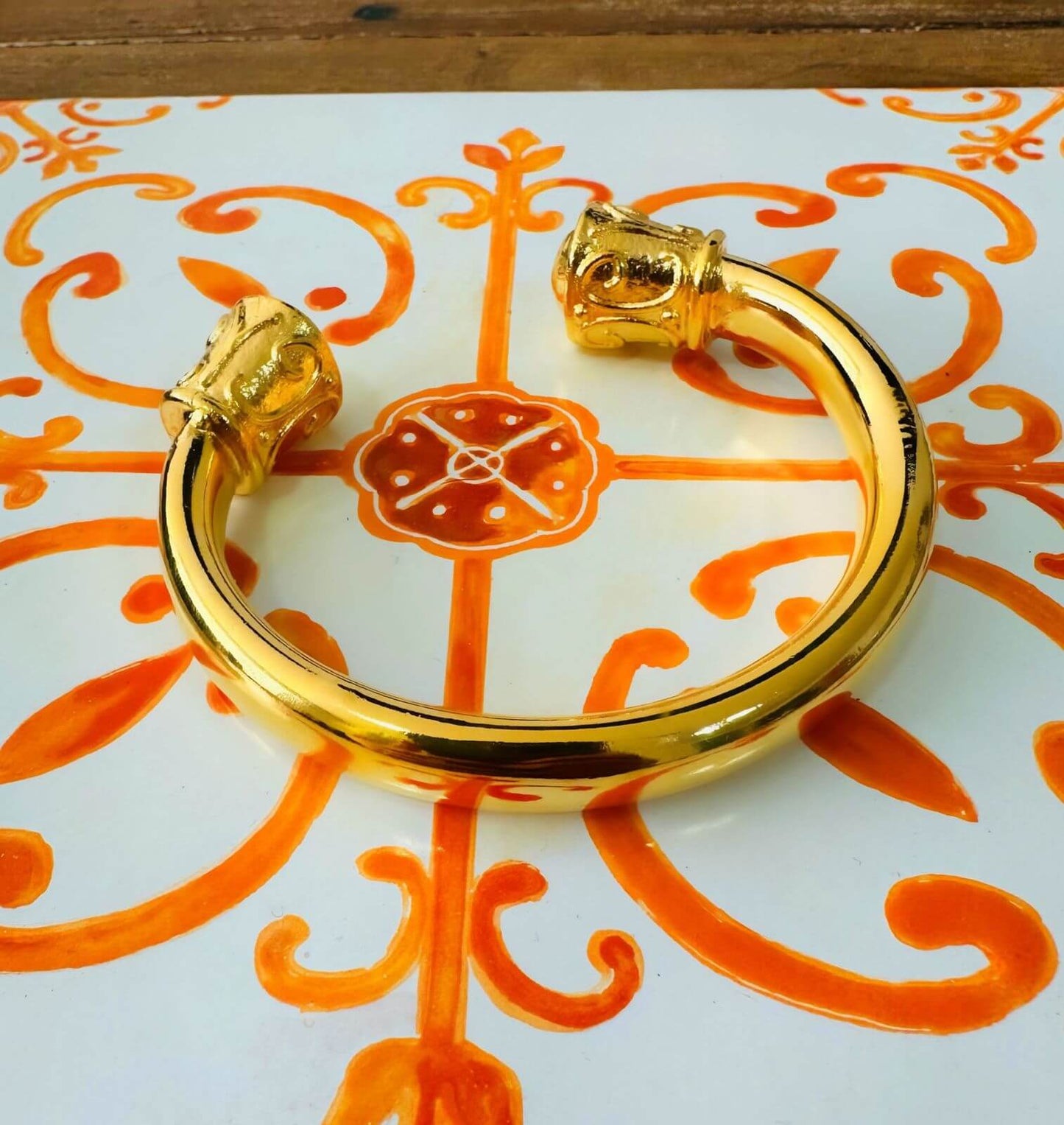Pulsera gruesa hecha de bronce macizo con enchape en oro de 24k y con puntas con arabescos.