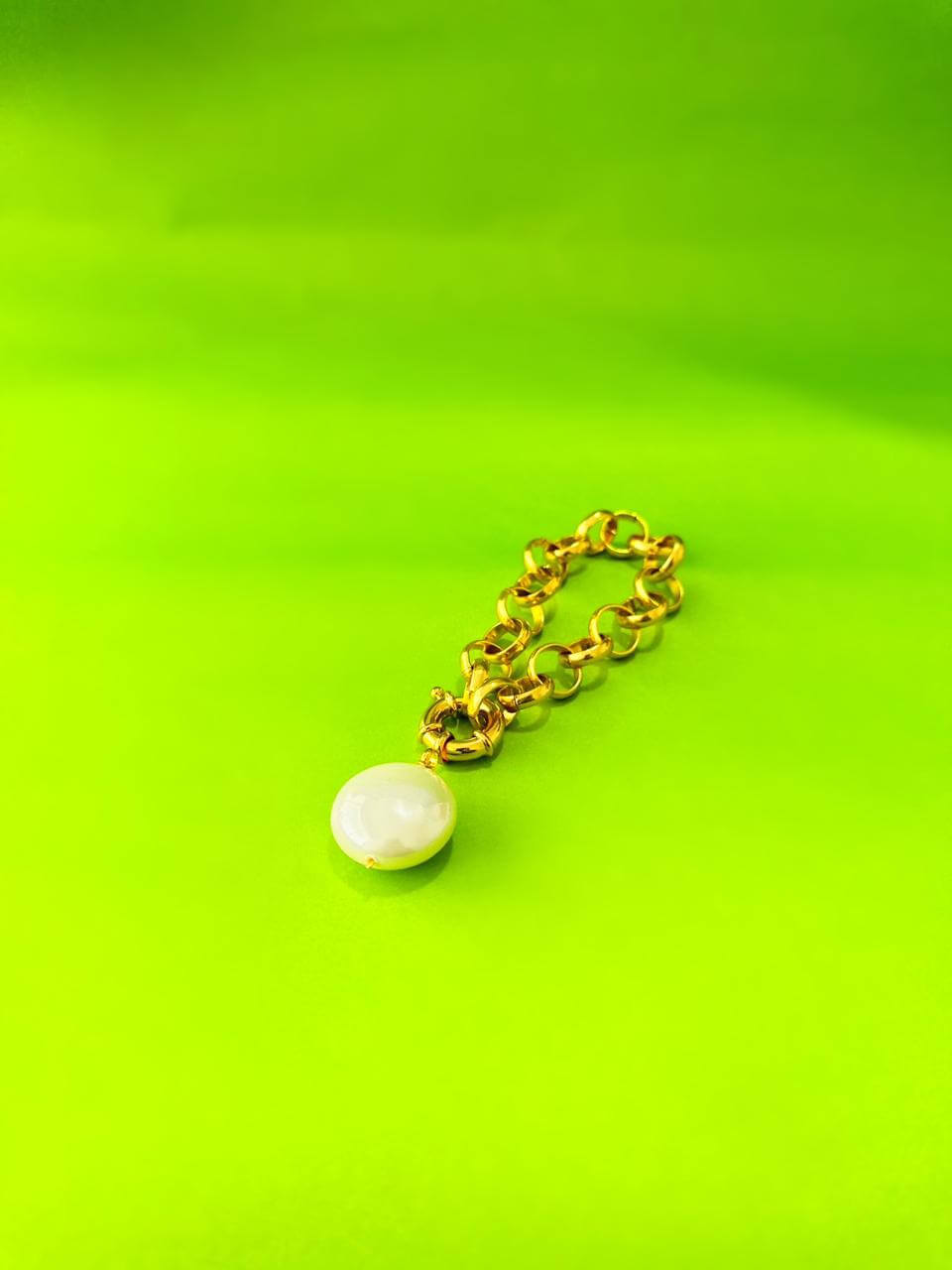 Pulsera hecha con cadena de eslabones circulares con broche hecho de bronce con enchape en oro de 24 kilates y perla shell.