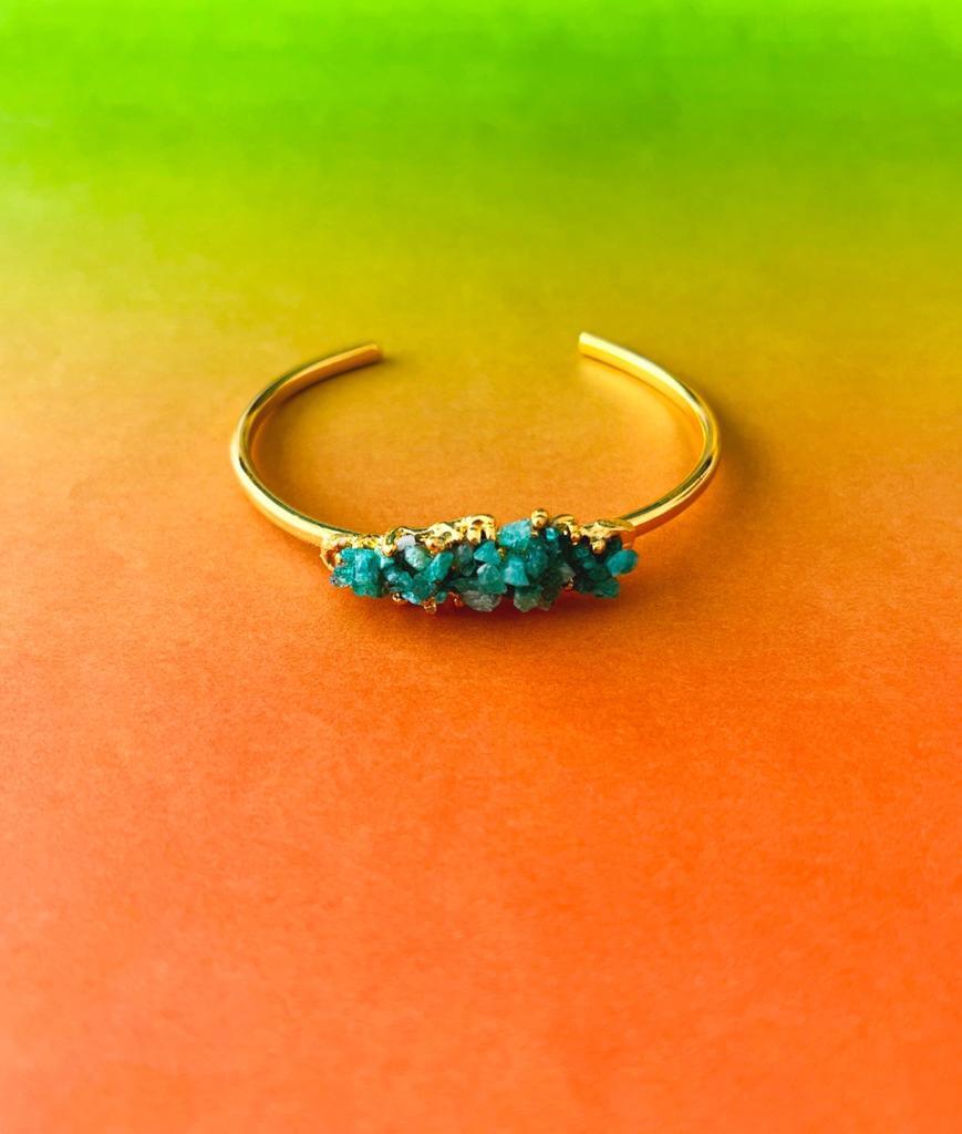 Hecha de bronce vaciado con enchape en oro de 24 kilates e incrustaciones de esmeraldas en bruto.