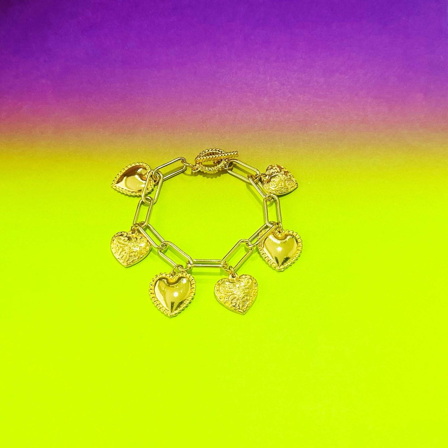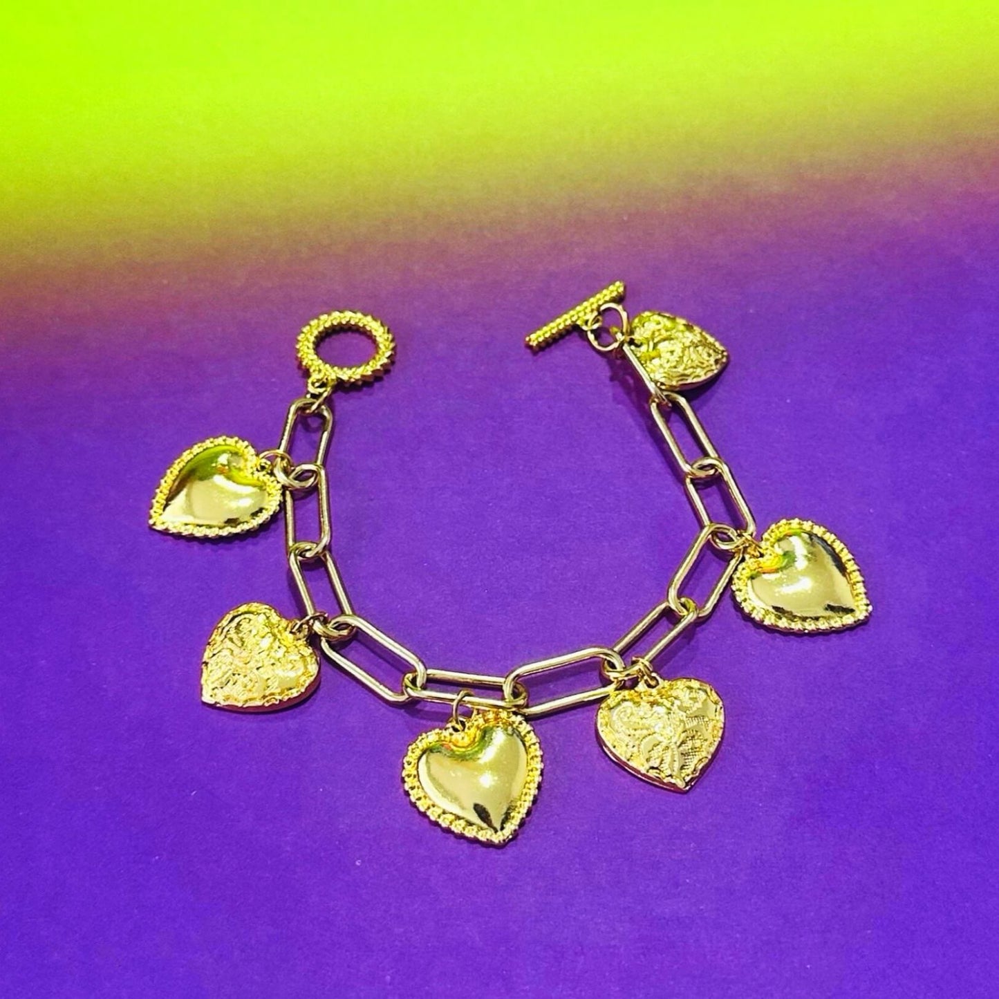 Una cadena enchapada en oro de 24 quilates con una variedad de nuestros colgantes y amuletos de corazón de bronce enchapado en oro de 24 quilates.