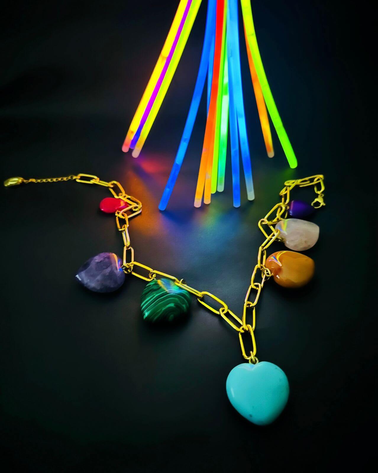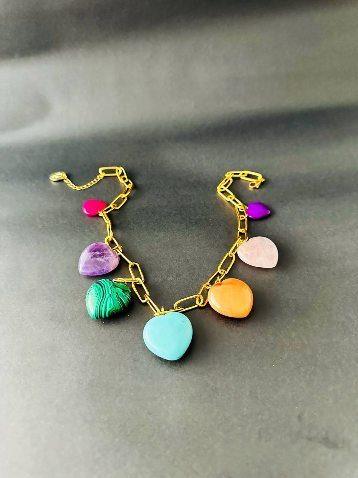 Collar hecho a mano con cadena de eslabones rectangulares y colgando corazones hechos de piedras semipreciosas, como por ejemplo: turquesa,malaquita, cuarzo, amatista, ágatas y cornalina.