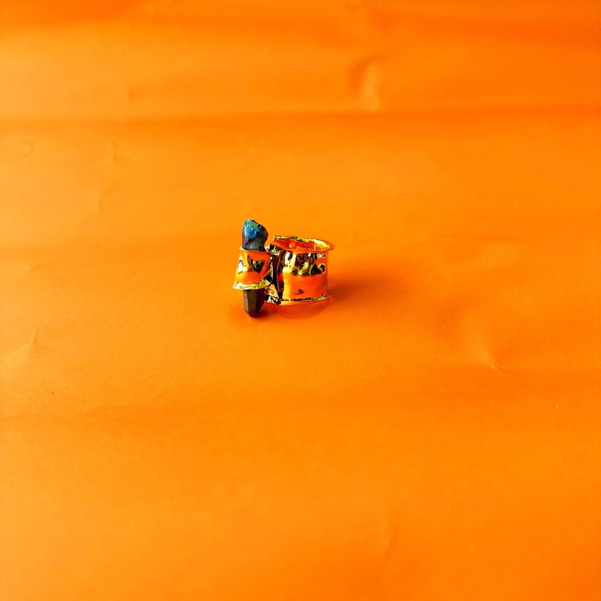 Está hecho de una lámina de metal de forma irregular, enchapado en oro y con incrustación de stick de piedra natural dursa tornasol, destacando la belleza de la asimetría y la perfecta imperfección.
