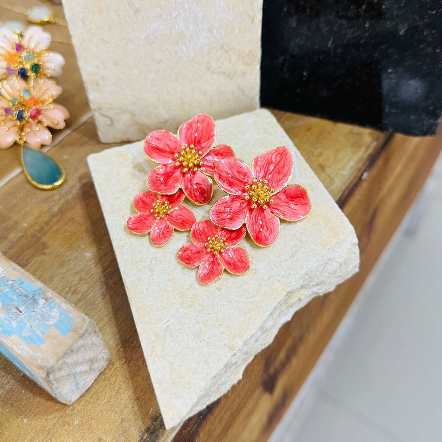 Aretes doble flor hechos de bronce vaciado con enchape en oro de 24k. También esmaltados horneados en múltiples colores. Centro hecho de pistilos hechos de bronce con enchape en oro de 24k.