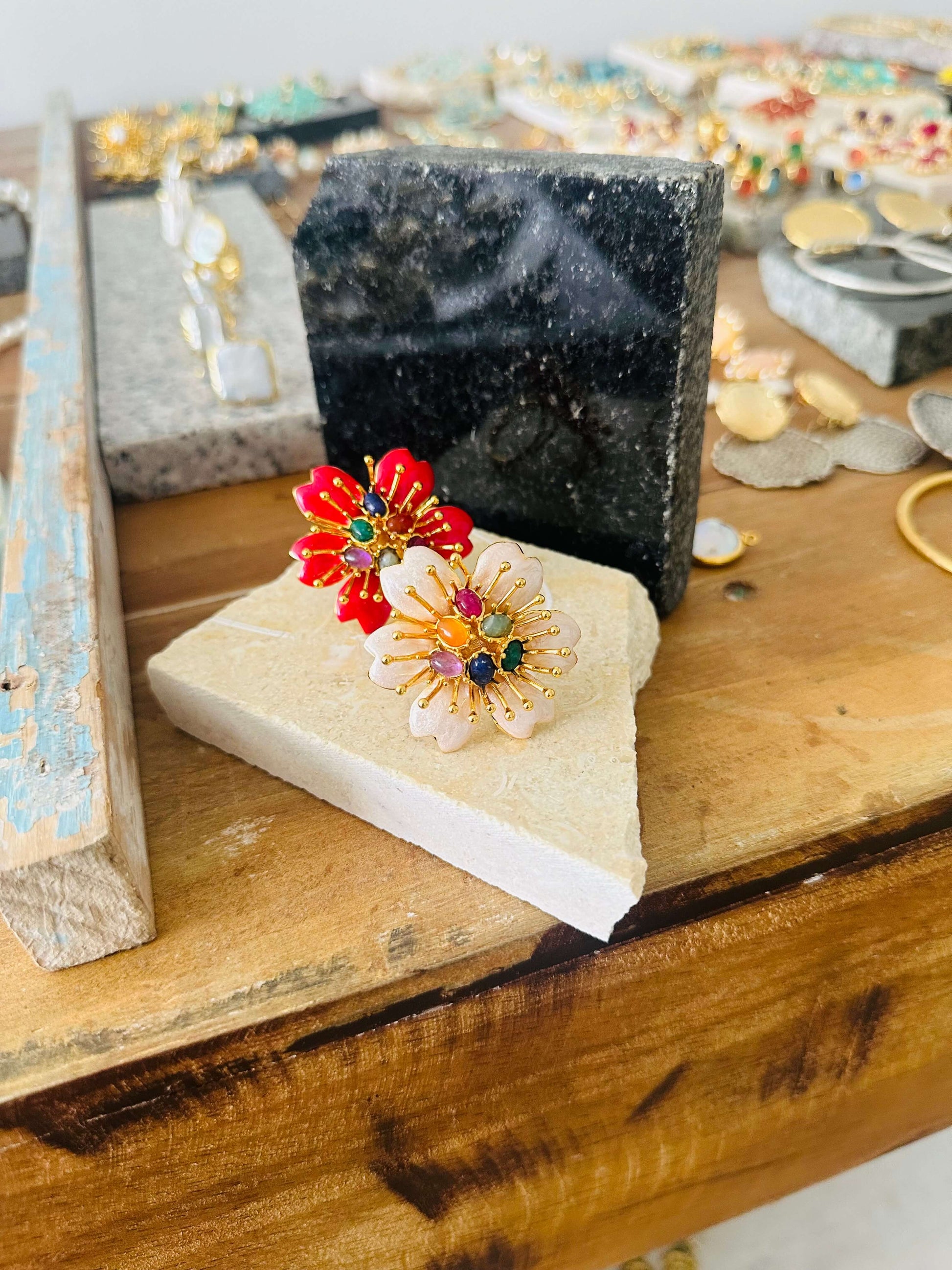 Anillo hecho de bronce con enchape en oro de 24k. También con esmaltes horneados y engaste de piedras semipreciosas con centro de pistilos enchapados.