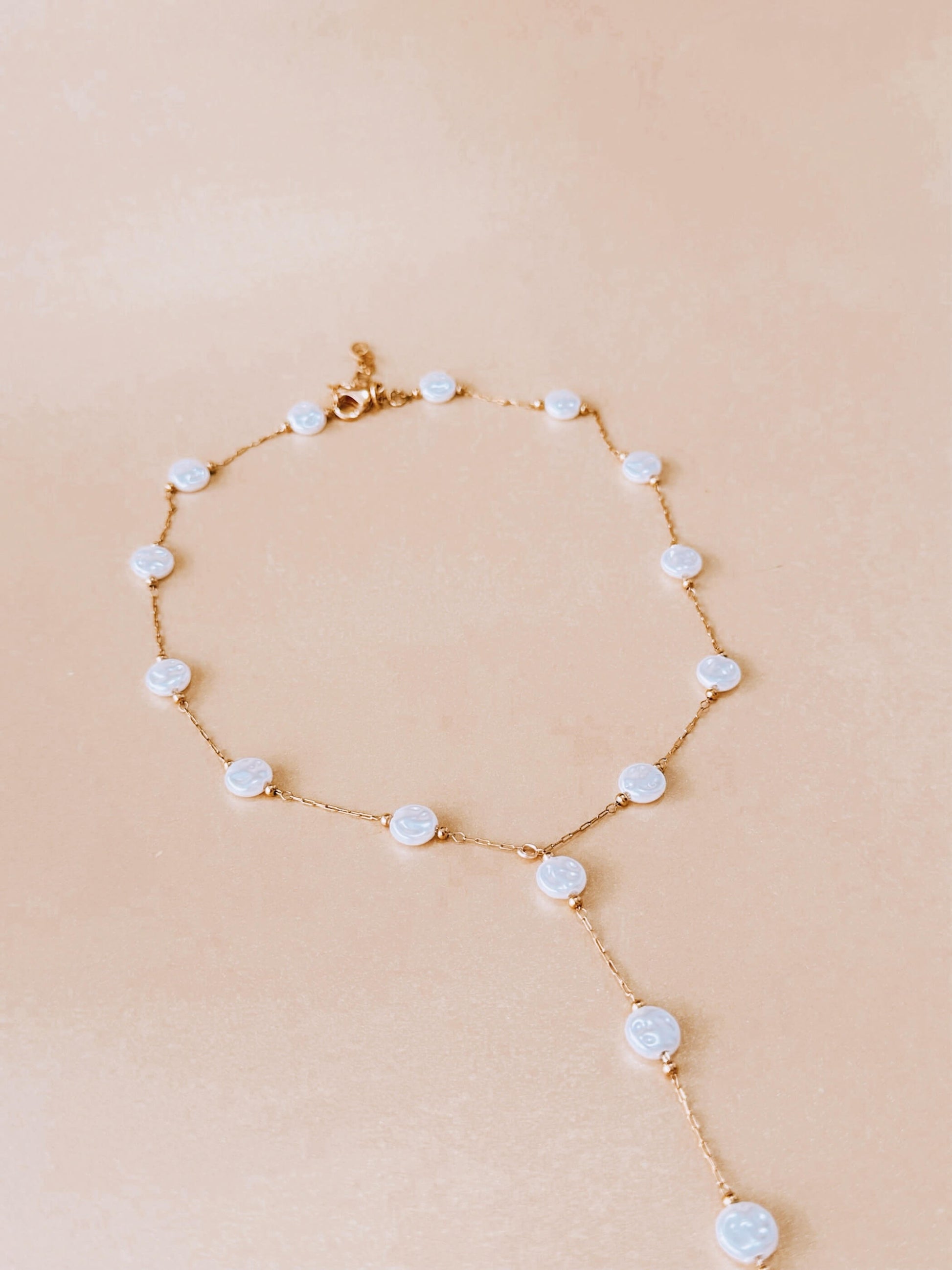 Collar largo hecho con cadena enchapa en oro de 24k y perlas shell circulares planas en los intermedios. Adicional cadena extensora y broche picoloro.
