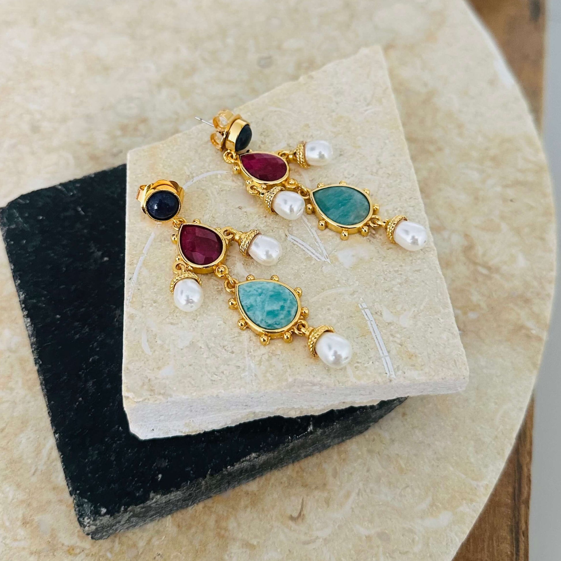 Aretes hechos a mano de bronce con enchape en oro de 24k y con engaste de perlas de agua dulce y piedras semipreciosas. También colgando una cultivada.