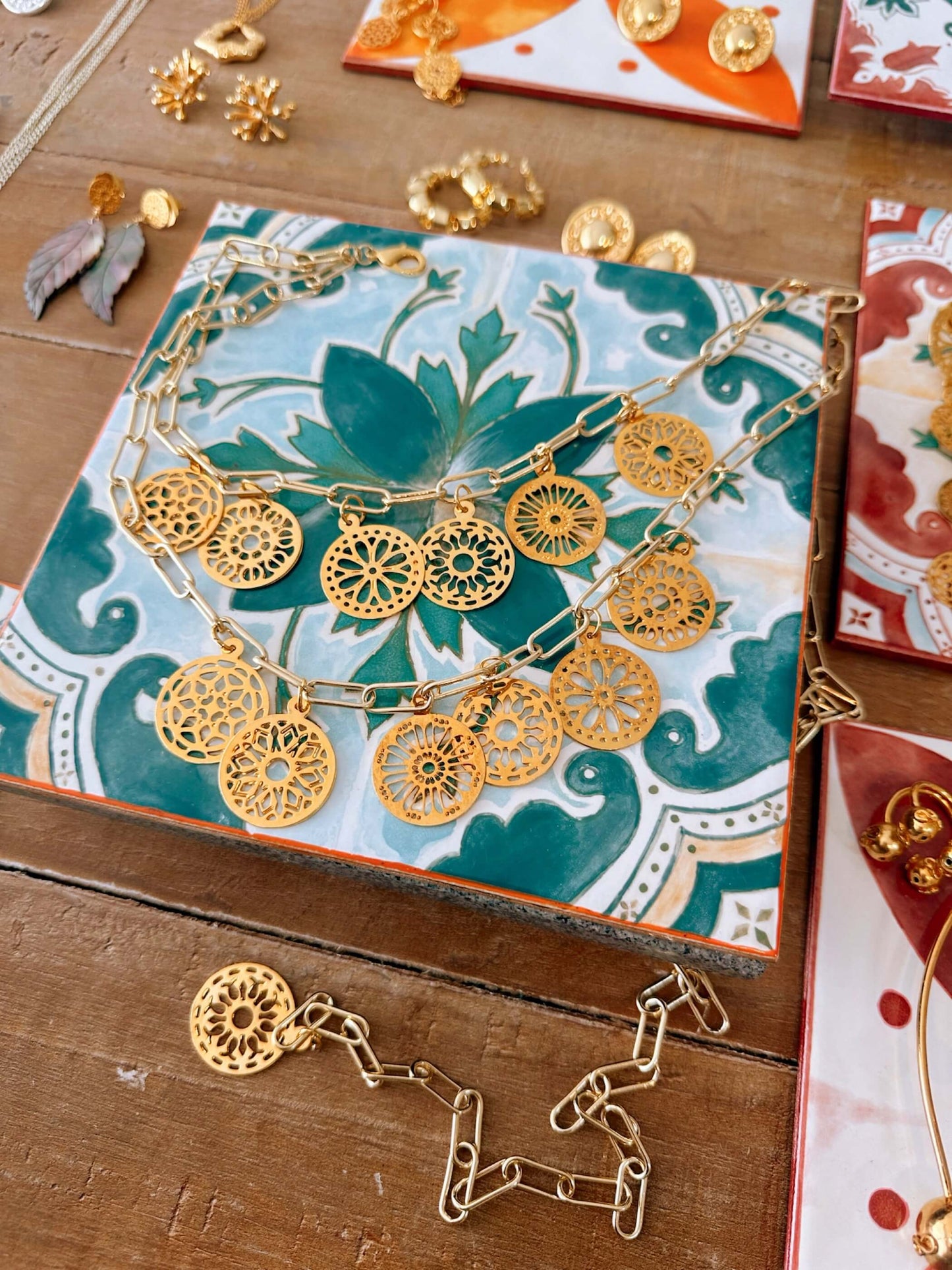 Cinturón hecho de eslabones de bronce con enchape en oro de 24k y monedas caladas hechas de bronce con enchape en oro de 24k colgando.